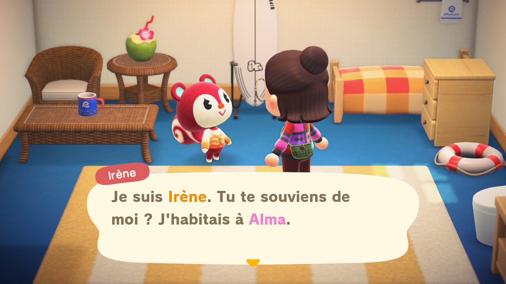 Première surprise : Dimitri ne s’est pas contenté de rester dans sa chambre (sans doute peu convaincu par la décoration). Il a tranquillement arpenté les rues de mon île, comme s’il était chez lui. Mais ce n’était qu’un avant-goût comparé à ce que me réservait ma deuxième cliente. Dès le lendemain, une adorable femelle écureuil prend la place de Dimitri dans cette même chambre décorée à la va-vite. Quelle ne fut pas ma surprise lorsqu’Irène, me dit, très naturellement : « Je suis Irène. Tu te souviens de moi ? J’habitais à Alma ». Encore une nouveauté que Nintendo s’était gardé de nous révéler : les anciens villageois que vous avez poussé vers la sortie peuvent tout à fait revenir sur votre île.