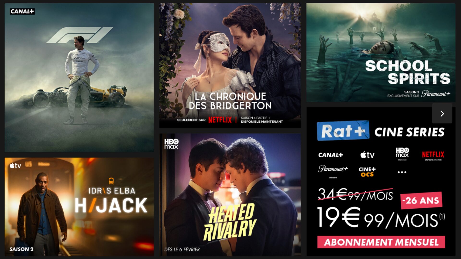 L’offre Rat + Ciné Séries de Canal+ est réservée aux moins de 26 ans, et comprend le bouquet Canal+ et l’ensemble de son contenu, ainsi qu’Apple TV+, Netflix, Paramount+, OCS, et HBO Max, au prix de 19,99 € par mois sans engagement. Vous avez jusqu’au 12 mars 2026 pour souscrire à l’abonnement.