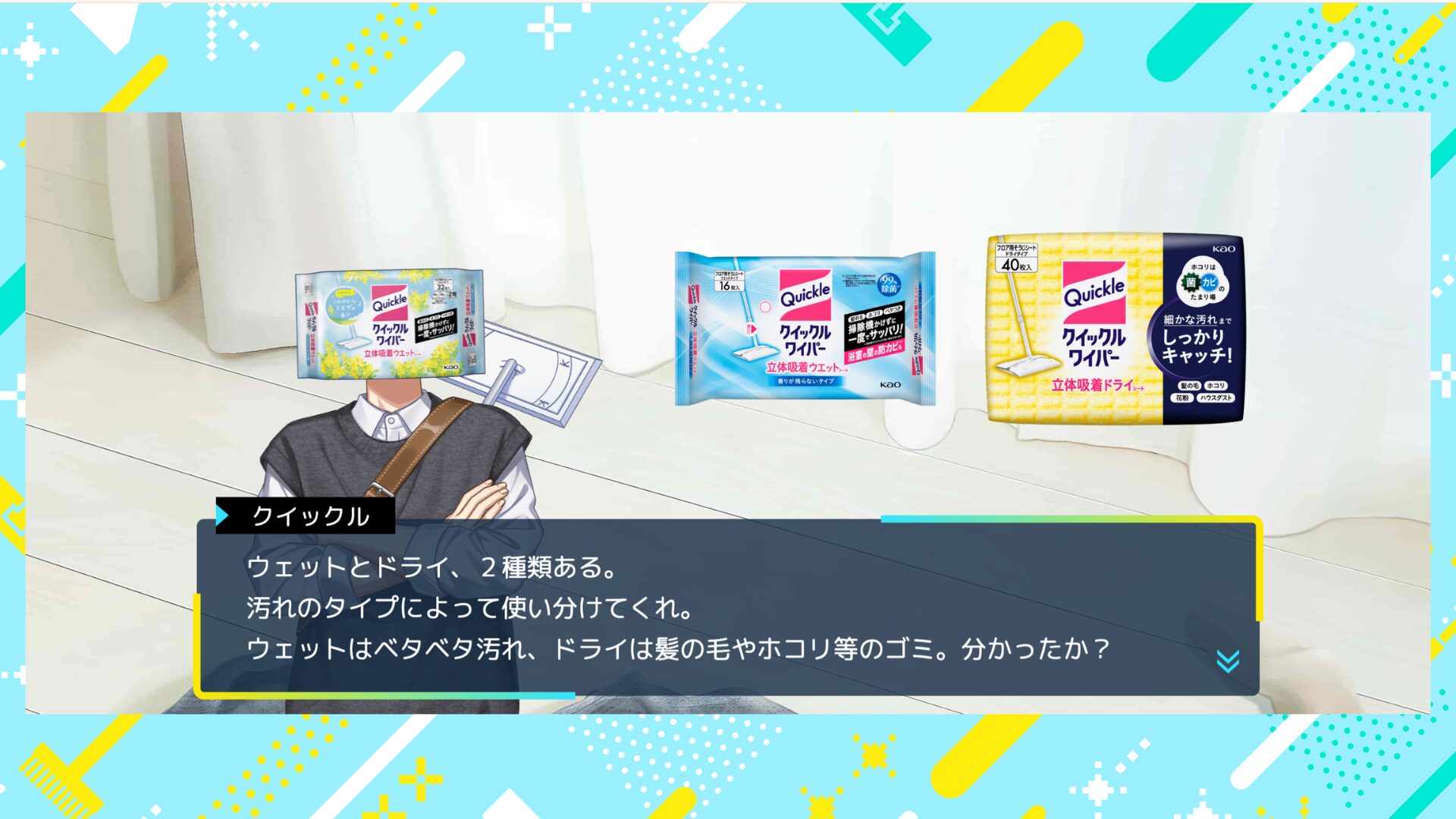 Qui allez-vous préférer entre Cucute (Kyukyutto), liquide vaisselle joyeux et positif, et Bath Magiclean, nettoyant pour baignoire narcissique ? Peut-être serez-vous finalement conquis par le nettoyant WC Toilet Magiclean, obsédé par la beauté. À moins que le balai et ses lingettes Quickle Wiper, timide et pragmatique, ne s’empare de votre cœur. Chaque protagoniste dispose d’un CV et de caractéristiques bien définies — de quoi vous guider dans votre choix.