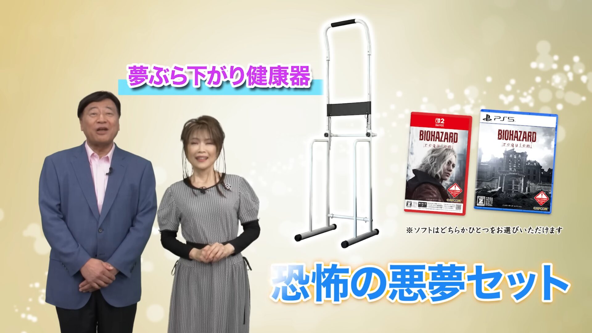 Sauf qu’à Yume Group, on ne consomme pas que du thé matcha pendant la pause. Confiante, l’entreprise a débarqué avec un pack baptisé « Coffret Cauchemar Terrifiant », qui contient un exemplaire de Resident Evil Requiem pour PlayStation 5 ou Nintendo Switch 2, ainsi… qu’une barre de traction.