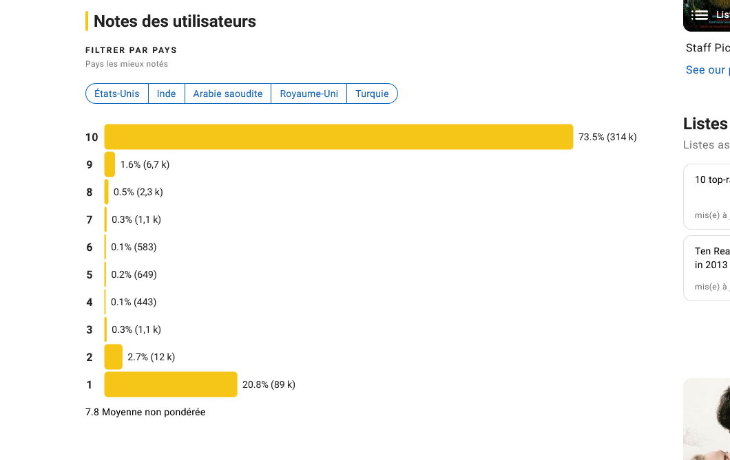 Ce n’est pas seulement la moyenne qui interpelle, mais la structure même des votes. En jetant un œil aux statistiques détaillées d’IMDb, on découvre l’anomalie : plus de 20 % des votants (soit environ 89 000 personnes) ont attribué la note de 1/10 à Ozymandias. Un comportement caractéristique d’un review bombing à des fins néfastes.