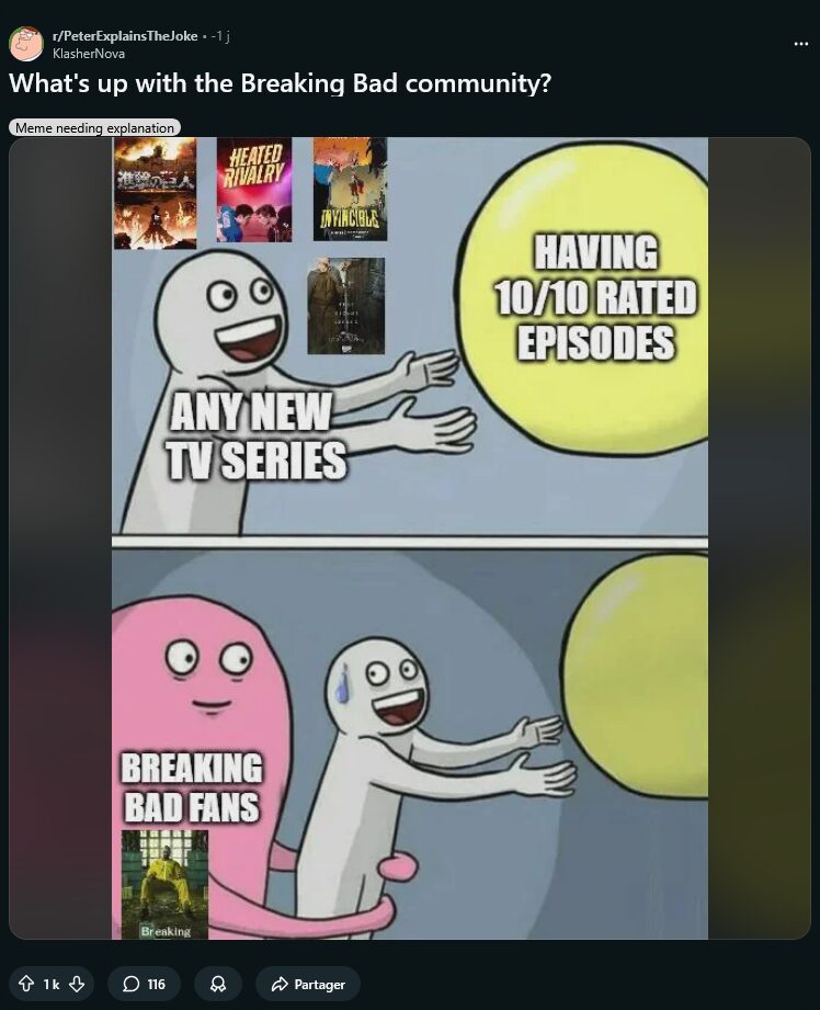 La situation a en tout cas suscité bien des commentaires, que ce soit sur le fonctionnement d’IMDb qui n’arrive pas à empêcher ces raids numériques, ou sur l’attitude désagréable que peuvent avoir les fandoms. D’autres, encore, trouvent que ce qui arrive à Breaking Bad est bien mérité, après des années à vouloir empêcher d’autres 10/10 d’émerger.