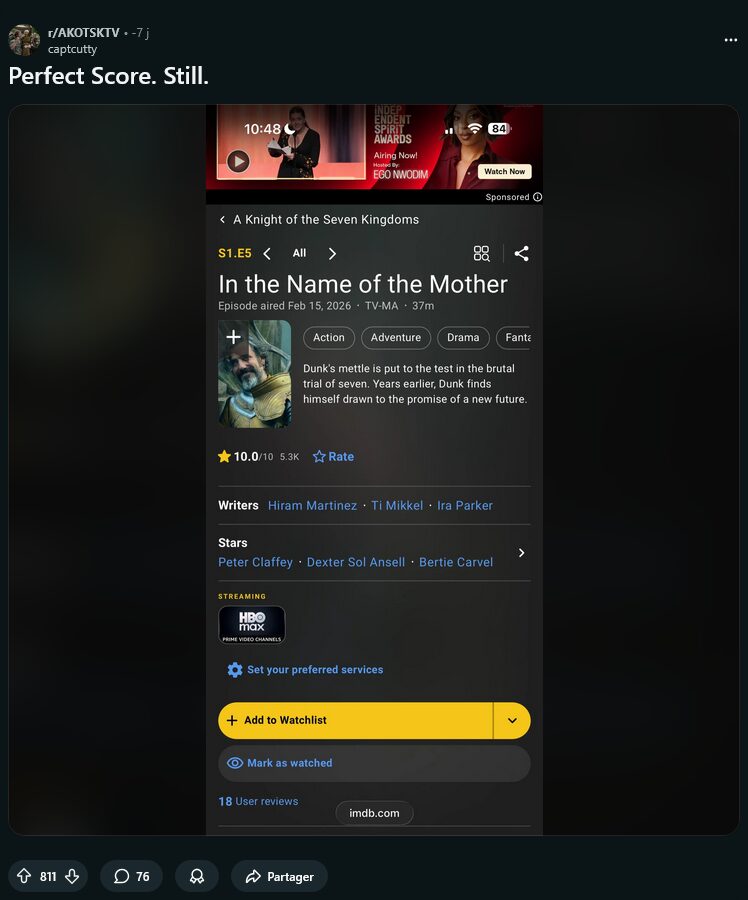 Résultat des courses ? Le 10/10 d’Ozymandias a disparu : aujourd’hui, l’épisode n’atteint plus « que » 9,6/10. Une note toujours excellente, mais qui ne possède plus son ancienne perfection. HBO s’en amuse même avec une ultime séquence un peu trollesque, dans laquelle on peut voir certains protagonistes de A Knight of the Seven Kingdoms danser de joie.