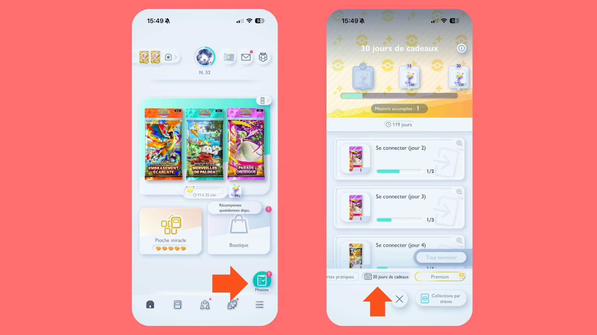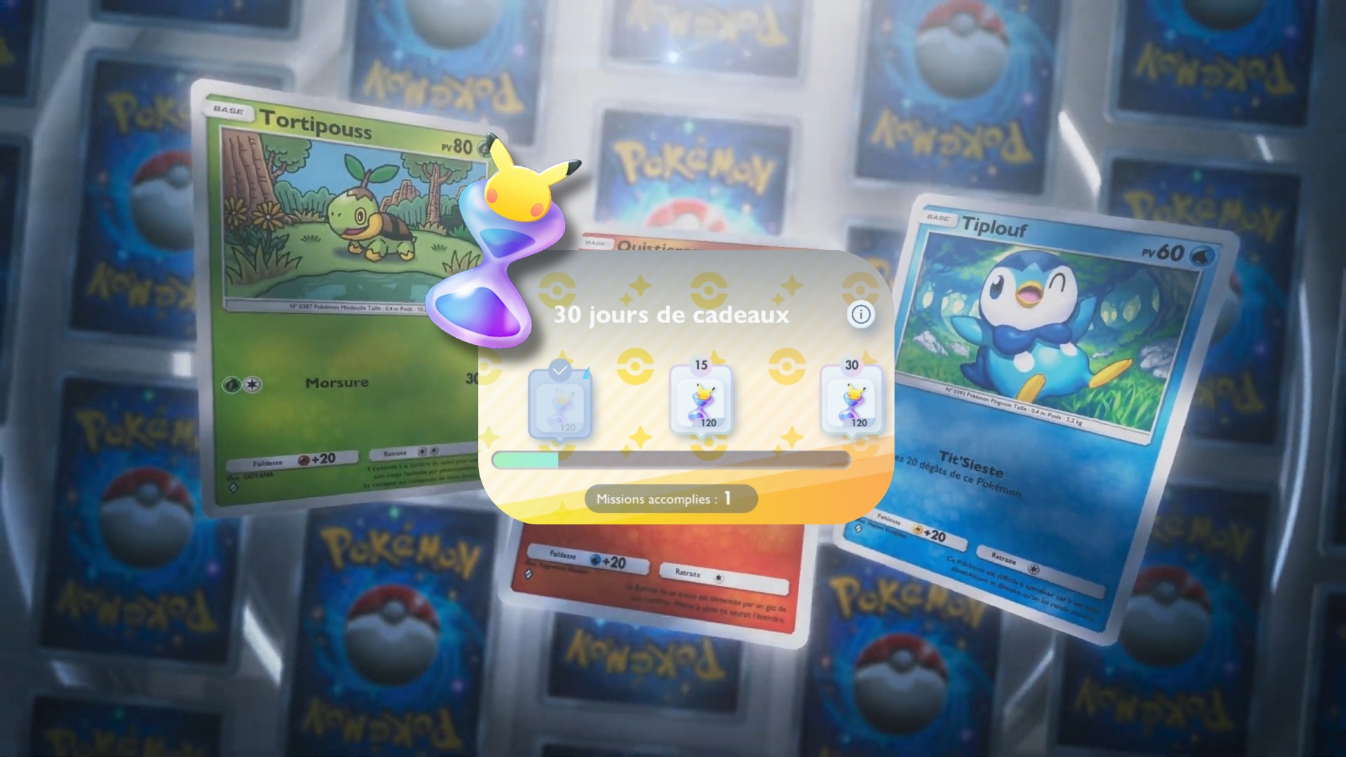 En plus des sabliers offerts par paliers, chaque mission distribue automatiquement un cadeau unique chaque jour (dont des boosters supplémentaires) où vous lancez l’application. Même si vous n’avez pas le temps de faire un combat, pensez à ouvrir le jeu quelques secondes pour récupérer ces objets. C’est aussi l’occasion de compléter la nouvelle collection Merveilles de Paldea fraîchement sortie sans dépenser un centime.