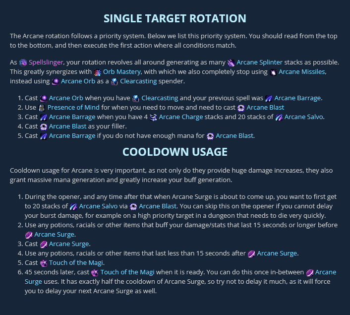 Ensuite, on peut l’utiliser comme un outil d’apprentissage, car le bouton affiche l’icône du prochain sort qui va être lancé. Il suffit alors d’activer soi-même le sort correspondant dans sa barre classique pour esquiver la pénalité de 25 % sur le GCD. J’avoue avoir testé cette approche d’imitation de temps en temps durant la montée en niveau de mon personnage ; c’est un peu fastidieux, mais d’autres y trouveront sûrement leur compte.
