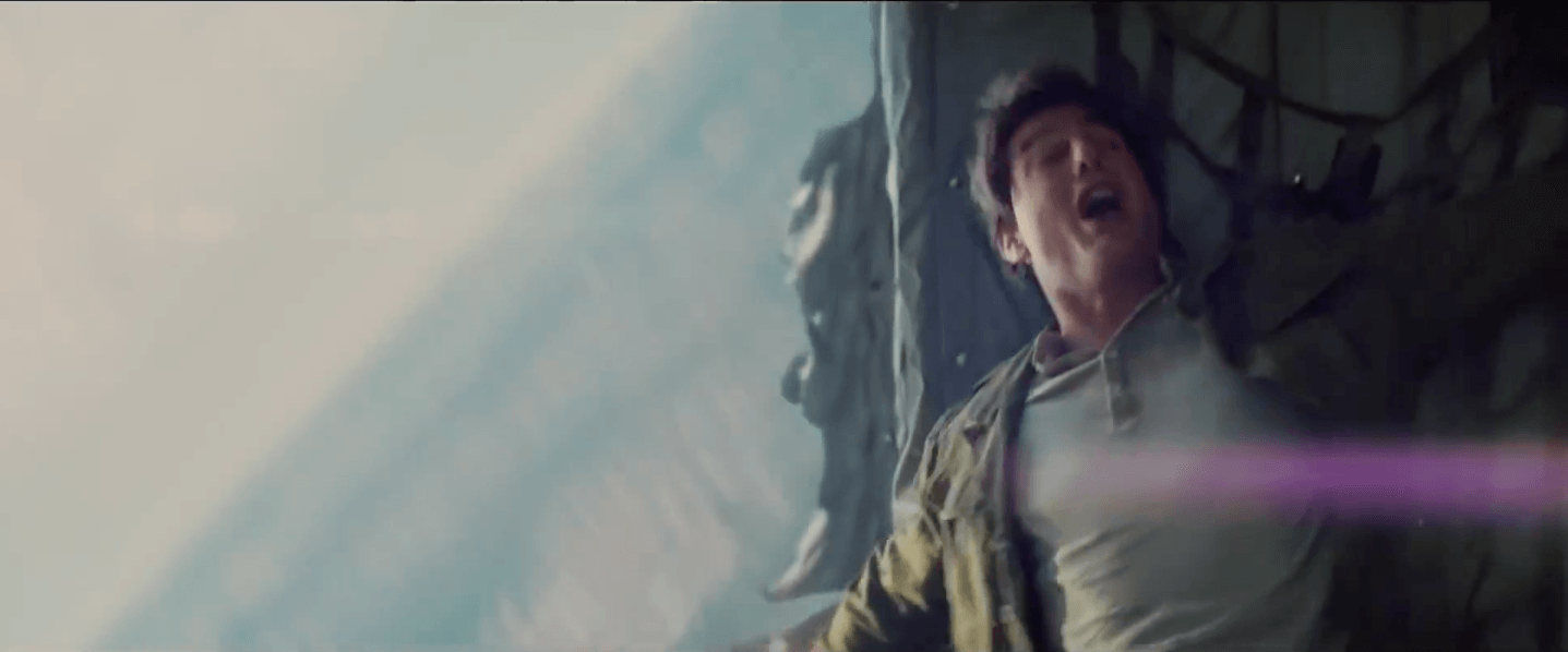 On y voit — et entend — Tom Cruise pousser des grognements plutôt ridicules sans aucun accompagnement sonore, alors que son avion est sur le point de s’écraser.