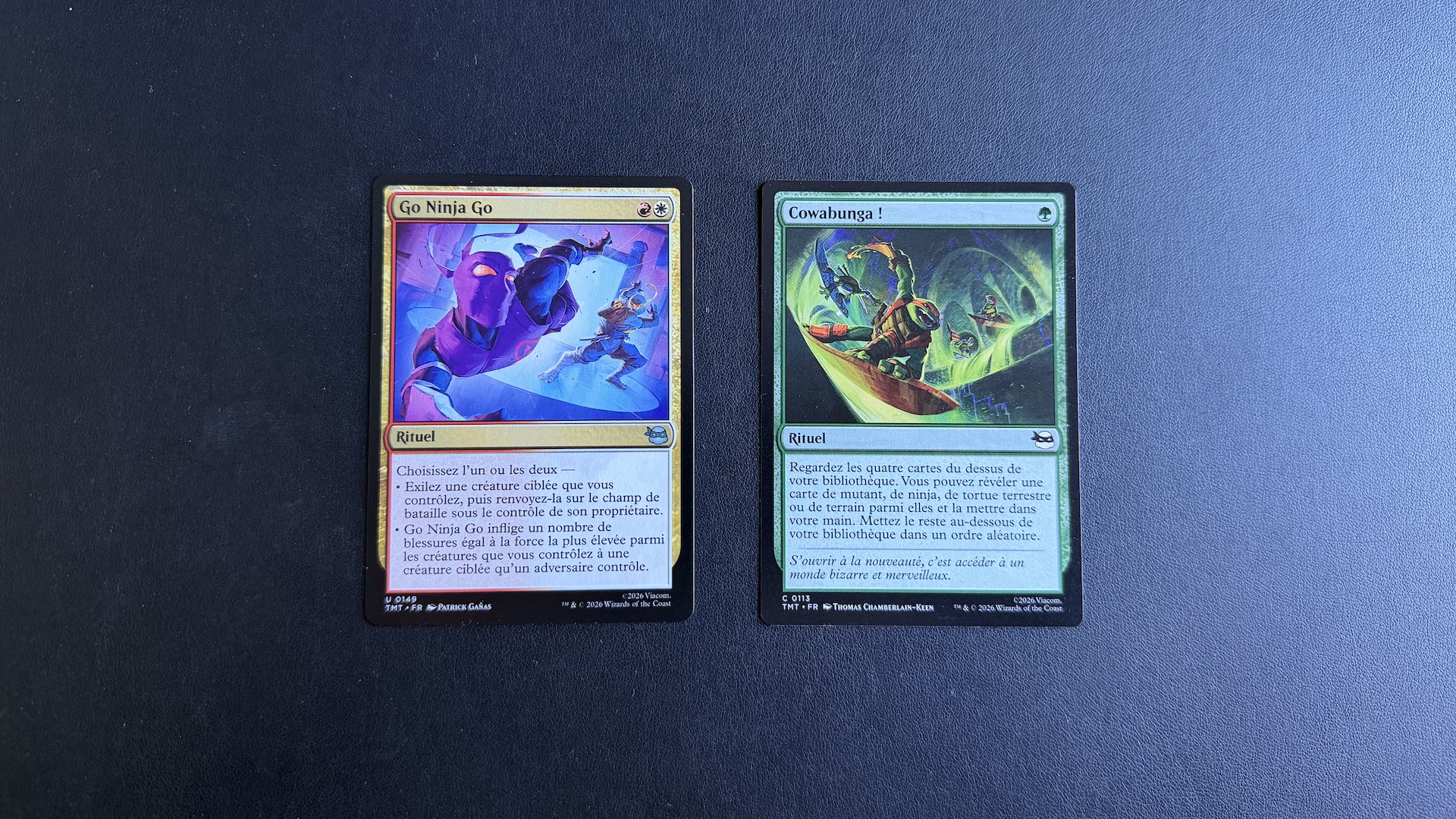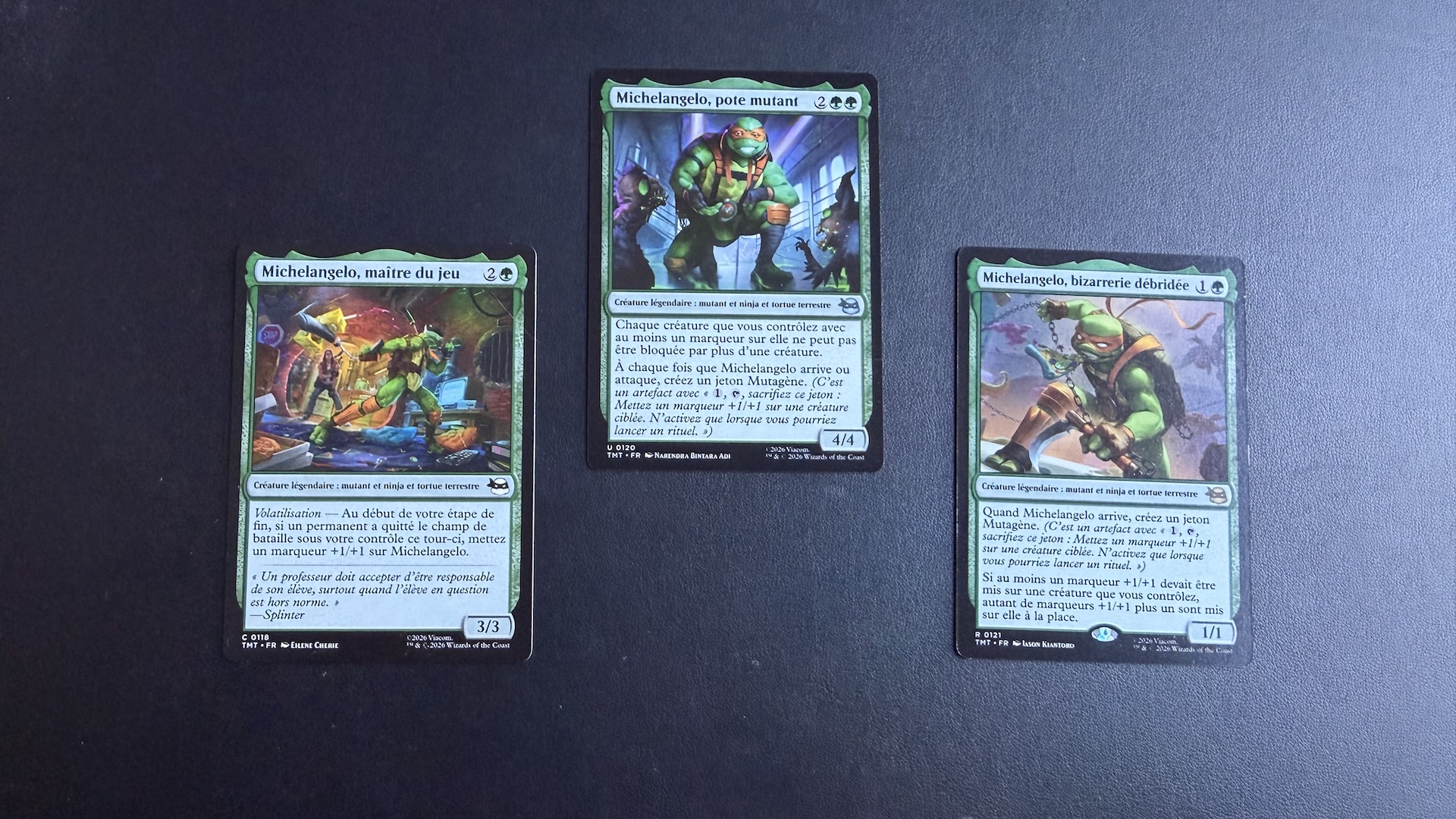 Au-delà de l’aspect collection, qui parlera plus volontiers aux fans avides d’objets à arborer sur leur étagère, il faut s’intéresser à l’aspect ludique de l’extension Tortues Ninja. Premier point rigolo : Wizards of the Coast s’est arrangé pour que chaque booster contienne au moins une tortue. Comment ? Les quatre héros — Leonardo, Raphael, Michelangelo et Donatello — sont déclinés en différentes raretés, ce qui veut dire qu’ils ont droit à différentes versions (plus ou moins puissantes).