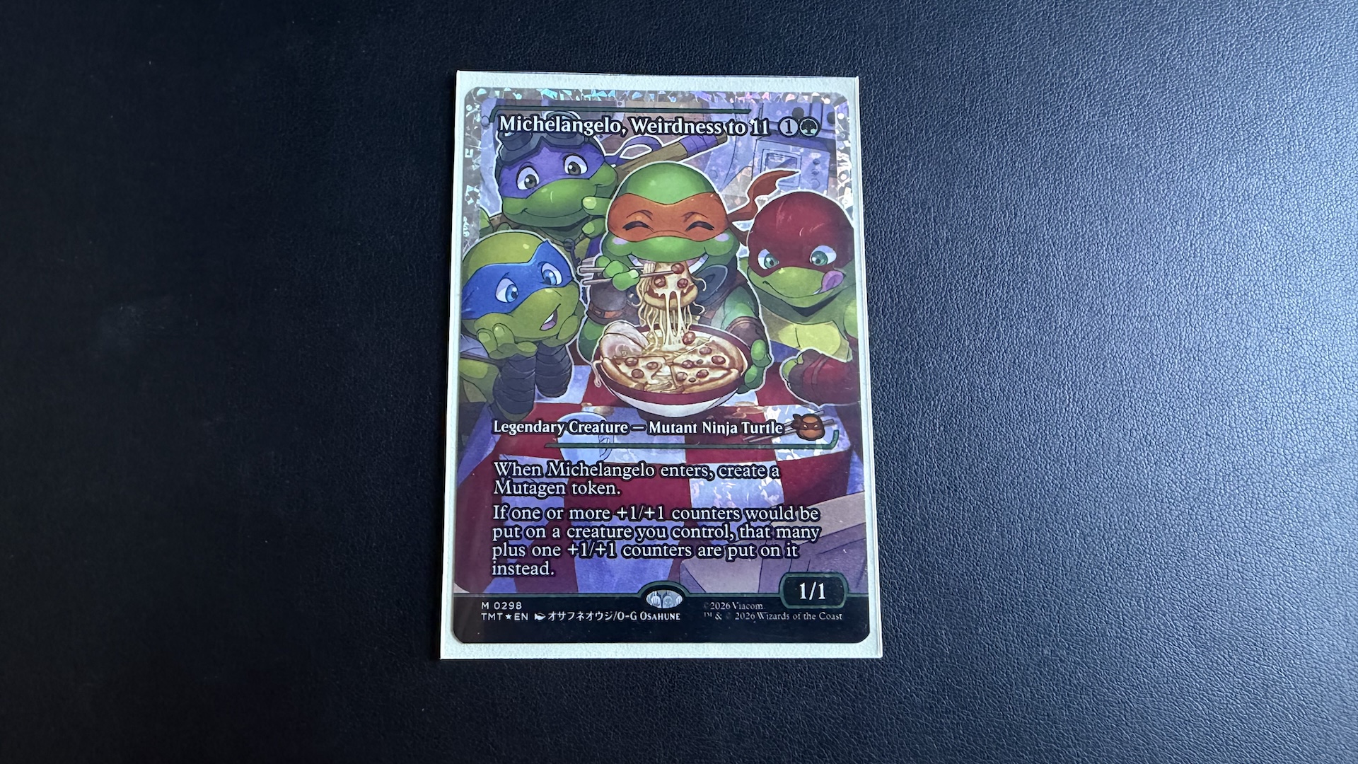 En tout cas, cette extension est l’occasion d’obtenir de très belles cartes, avec des illustrations qui font honneur à l’univers des tortues. Oui, certaines sont moins réussies que d’autres, mais les versions les plus rares valent vraiment le détour — mention spéciale à mon Michelangelo en fractured foil (qui vaut quelques dizaines d’euros). Oui, Wizards of the Coast imprime des billets de banque et nourrit la spéculation, mais c’est un élément incompressible des JCC, et il faut rappeler que les attributs esthétiques d’une carte n’ont aucun impact sur sa puissance intrinsèque.
