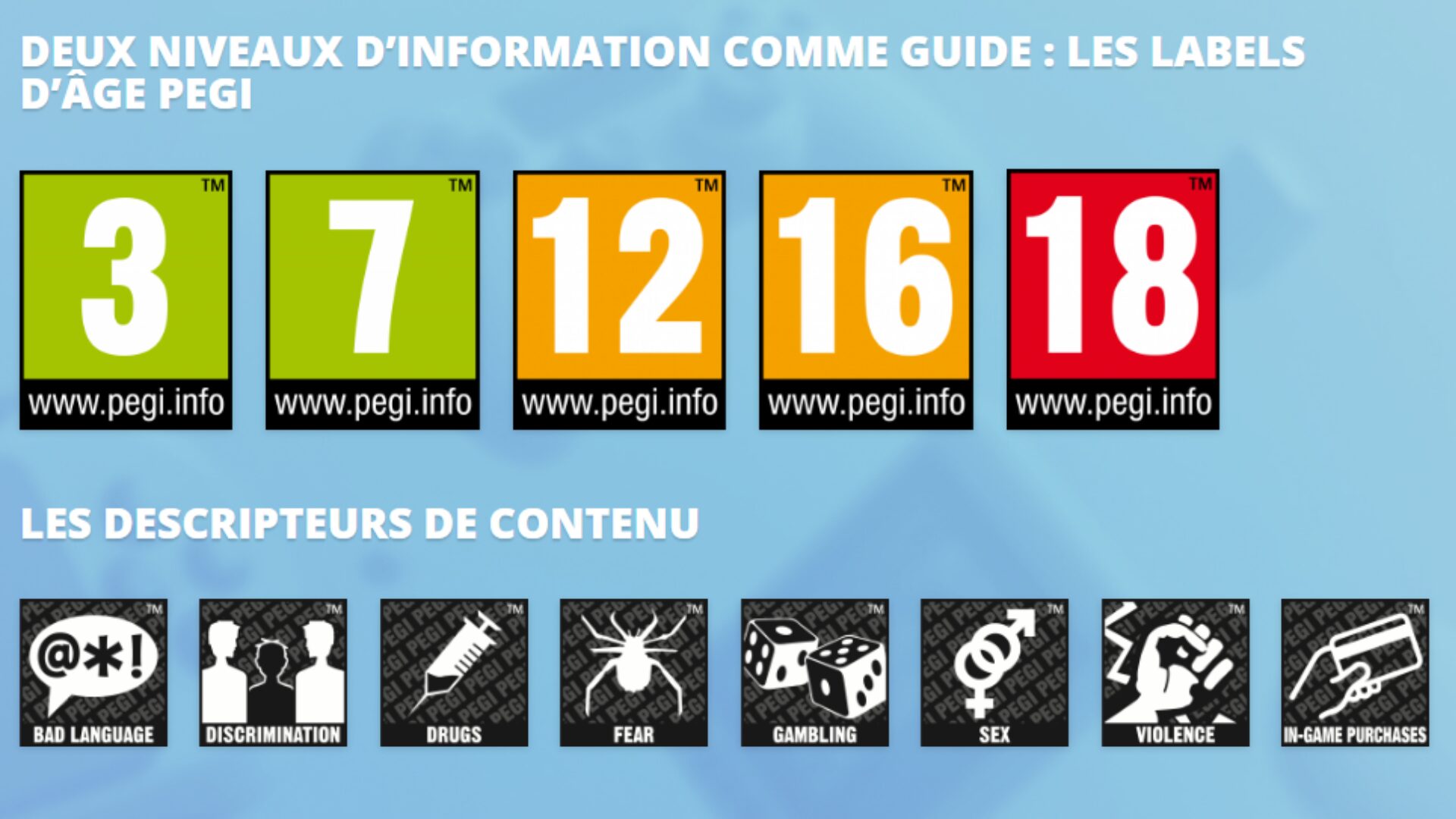 Vous connaissez le système de classification PEGI grâce aux trailers de jeux vidéo, lorsqu’une voix annonce avant chaque séquence le classement, par exemple « PEGI 3 ». Le système PEGI de classification par âge des jeux vidéo est utilisé dans de nombreux pays européens, et sert à indiquer si le jeu est approprié à l’âge des joueuses et des joueurs. Il est également affiché sur les pages des jeux dans les stores en ligne, et sur les versions physiques, via un macaron 3/7/12/16 ou 18 ans, et des pictogrammes indiquant les éléments susceptibles de choquer le public.