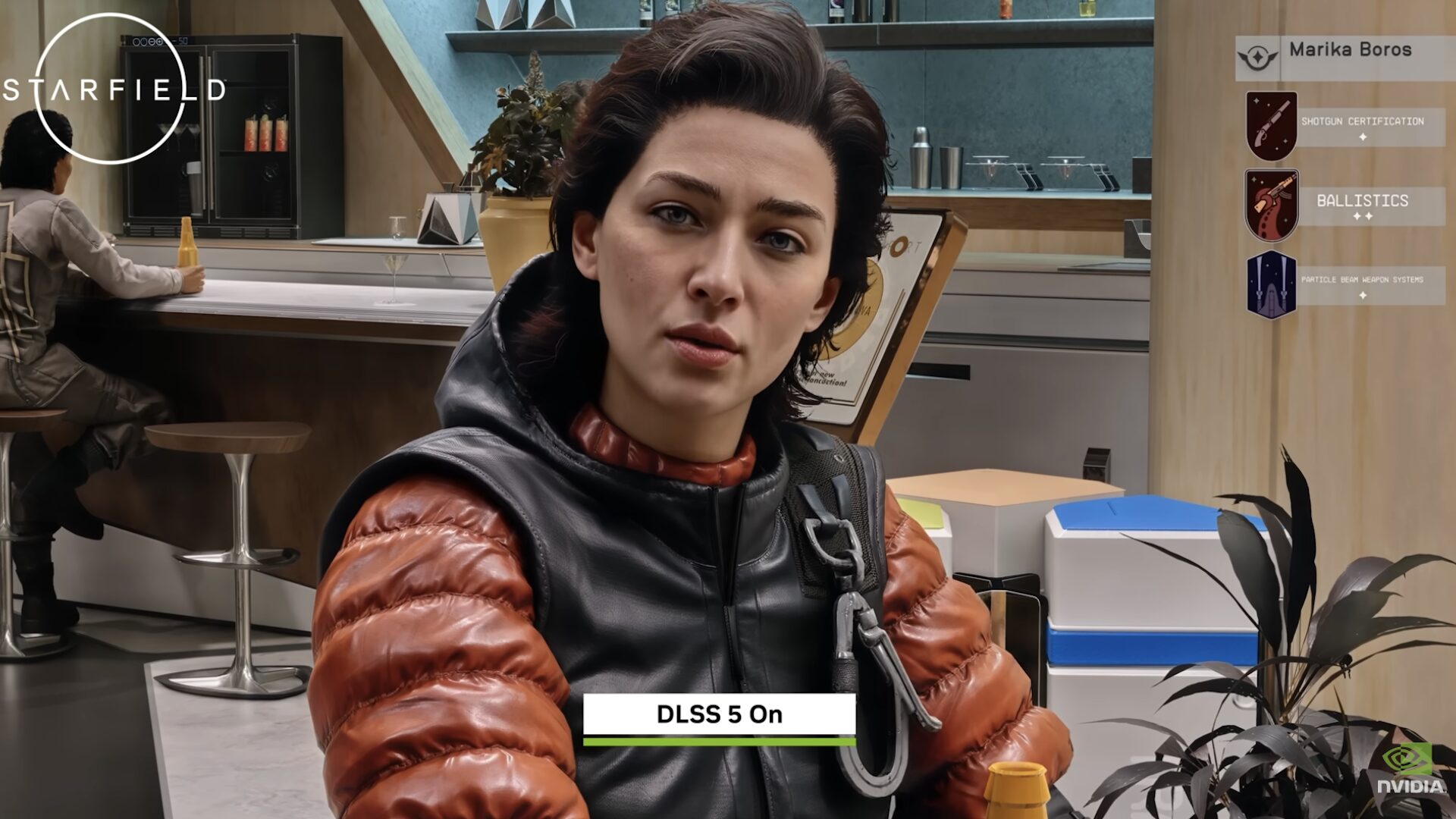 Même certains éclairages, supposés être le principal atout du DLSS 5, paraissent trop appuyés et artificiels pour convaincre (par exemple, les reflets sur la combinaison d’un personnage de Starfield). Tout porte à croire que Nvidia a poussé les curseurs un peu trop à fond pour les besoins de sa démonstration. Si l’objectif était d’en mettre plein la vue, c’est réussi. Mais un soupçon de dosage n’aurait pas fait de mal, et c’est déjà une marge de progression pour cette technologie.