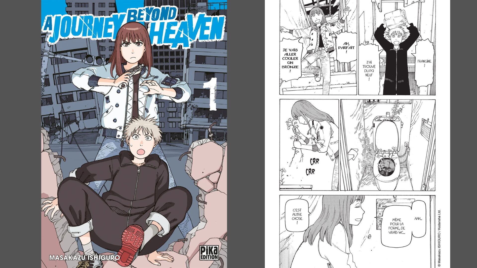 Maladies et catastrophes sont également au cœur de A Journey Beyond Heaven, le manga de Masakazu Ishiguro, publié depuis 2018 au Japon et, chez nous, depuis 2020 par Pika. Si les graphismes et l’histoire font d’abord penser à Akira, le rythme et la mise en scène s’inscrivent moins dans le dynamisme que dans la contemplation. Dans un monde où une catastrophe sans précédent a détruit la civilisation moderne, un groupe d’enfants vit dans un établissement isolé du monde extérieur, sous le contrôle de scientifiques. Ailleurs, un garçon voyage à travers ce Japon dévasté à la recherche d’un lieu au nom énigmatique.