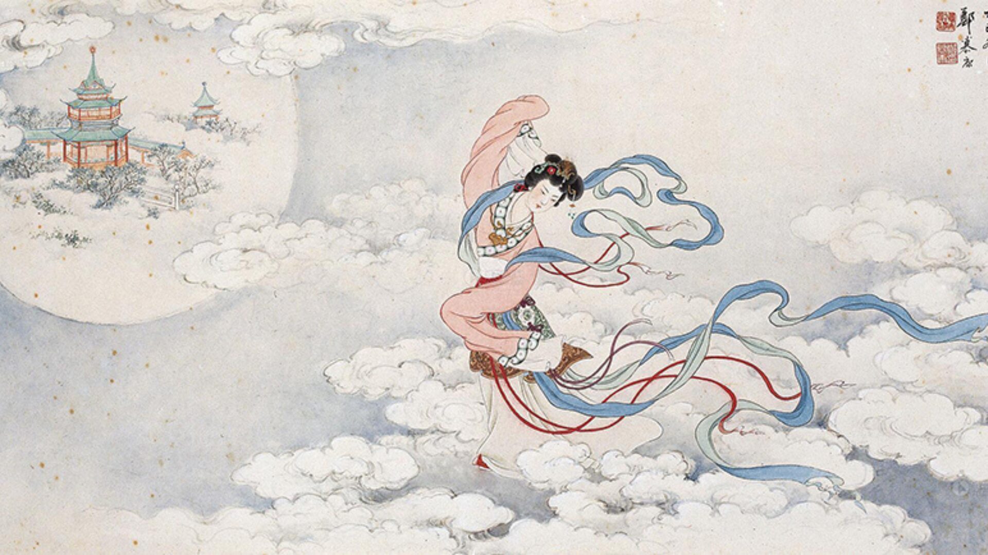 L’une des premières représentations de l’astre dans un conte remonte d’ailleurs au 3e siècle avant notre ère : Chang’e, une figure majeure de la mythologie chinoise et épouse de l’archer Hou Yi, héros qui sauva la Terre en abattant neuf des dix soleils qui brûlaient le monde, but l’élixir d’immortalité destiné à son mari. Elle s’éleva aussitôt dans le ciel jusqu’à la Lune, où elle devint immortelle et y réside seule, accompagnée d’un lapin de jade qui prépare l’élixir de vie.