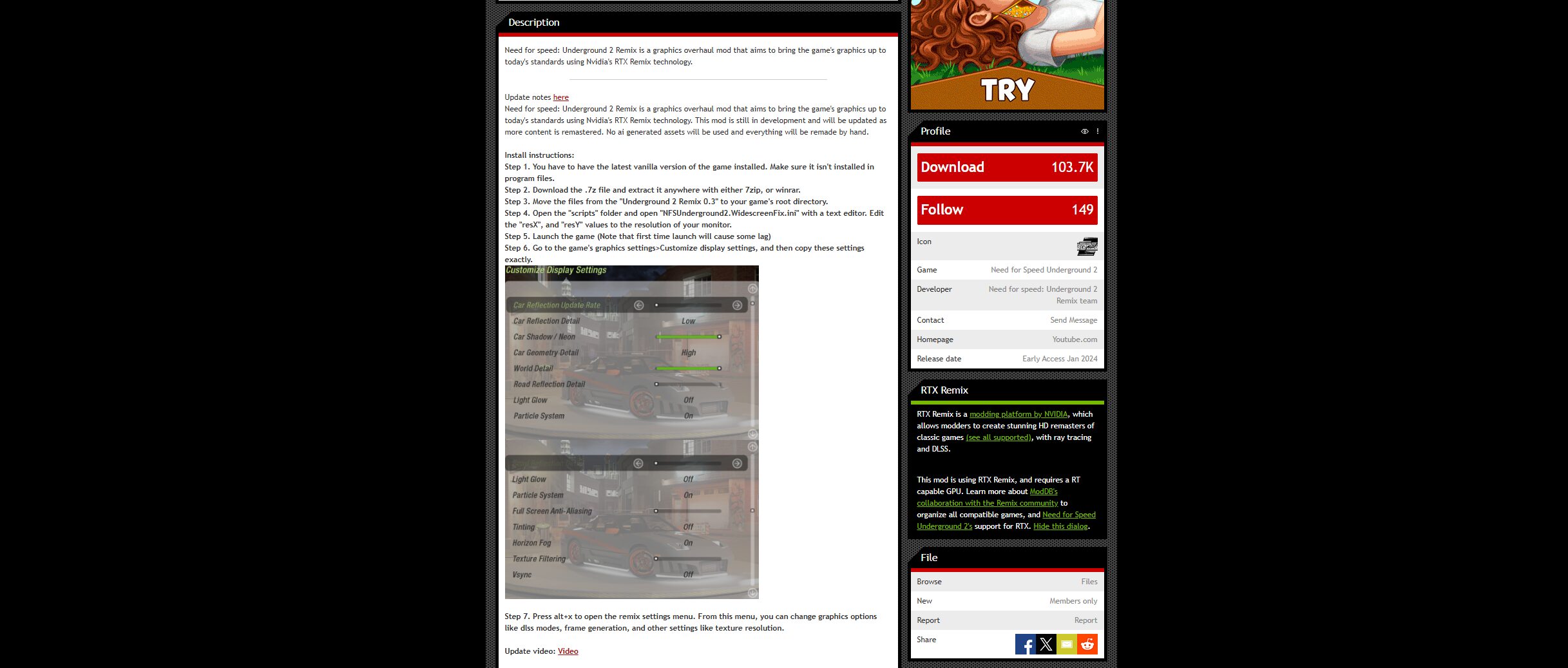 Pour illustrer cette méthode manuelle, nous avons choisi de modder le bon vieux Need for Speed Underground 2, sorti en 2004. On vous laisse vous débrouiller pour en trouver une copie. Ce jeu a l’avantage de disposer sur ModDB de l’un des meilleur mod RTX Remix du moment.