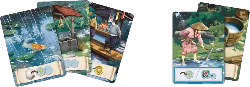 Méditer permet de récupérer l’une des cinq cartes proposées sur le plateau central, ainsi que les bonus associés (argent, nouvelles tuiles pour agrandir son bassin plus tard, etc.). Ces cartes sont variées. On trouve des artisans offrant des avantages pour la suite de la partie ou encore des parchemins rapportant des points de victoire si les conditions sont respectées. Il y a également les marchés pour acquérir des carpes, plus ou moins grandes selon leur coût, etc.