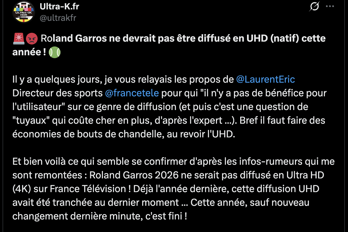 C’est le site spécialiste et bien renseigné Ultra-K.fr qui nous apprend la mauvaise nouvelle ce mardi 21 avril 2026, via son compte X. D’après ses sources, Roland-Garros ne sera tout simplement pas diffusé en 4K UHD sur les chaînes de France Télévisions. « Déjà l’année dernière, cette diffusion UHD avait été tranchée au dernier moment… Cette année, sauf nouveau changement de dernière minute, c’est fini ! », précise-t-il.