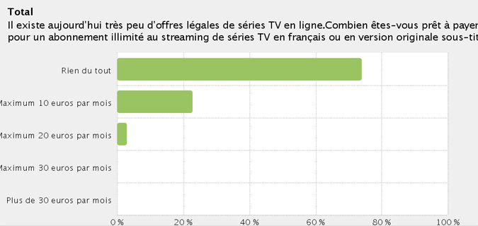 Pourtant, selon un sondage réalisé par respondi pour Numerama auprès d’un échantillon représentatif de 1021 personnes, 26 % des internautes français seraient prêts à payer pour avoir accès à une offre de streaming illimitée de séries TV :