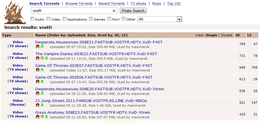 De même lorsque l’on recherche les fichiers contenant le sigle VOSTFR, pour « version originale sous-titrée en français », ce sont les séries qui arrivent en tête devant les films :