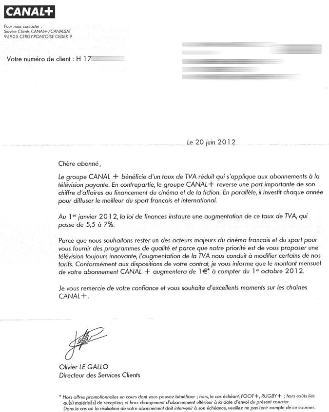 « Le montant mensuel de votre abonnement Canal + augmentera de 1 euro à compter du 1er octobre 2012« , nous dit la missive, qui se prive bien d’annoncer clairement le nouveau tarif.