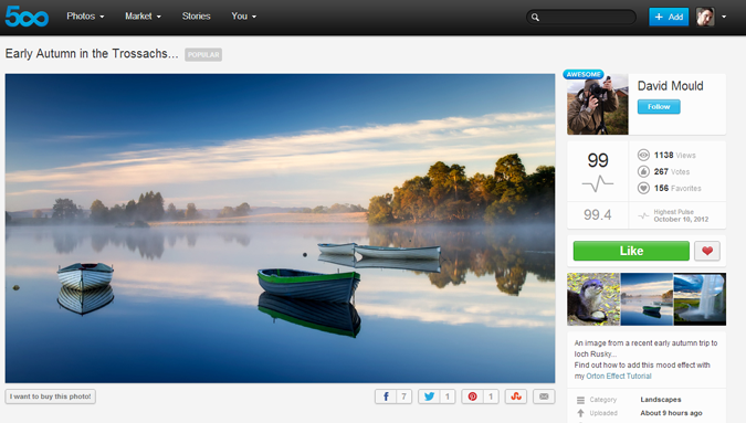 Or sur Internet, la critique instantanée est la règle. Elle s'impose à l'artiste. Le site de photographies 500px, qui tente de rivaliser avec Flickr, a basé une grande part de son interface sur l'interactivité immédiate, avec la possibilité de "liker", de "favoriser" et de commenter les oeuvres. Un score est calculé, dit "pulse", qui fait office de jugement collectif sur la qualité des clichés :