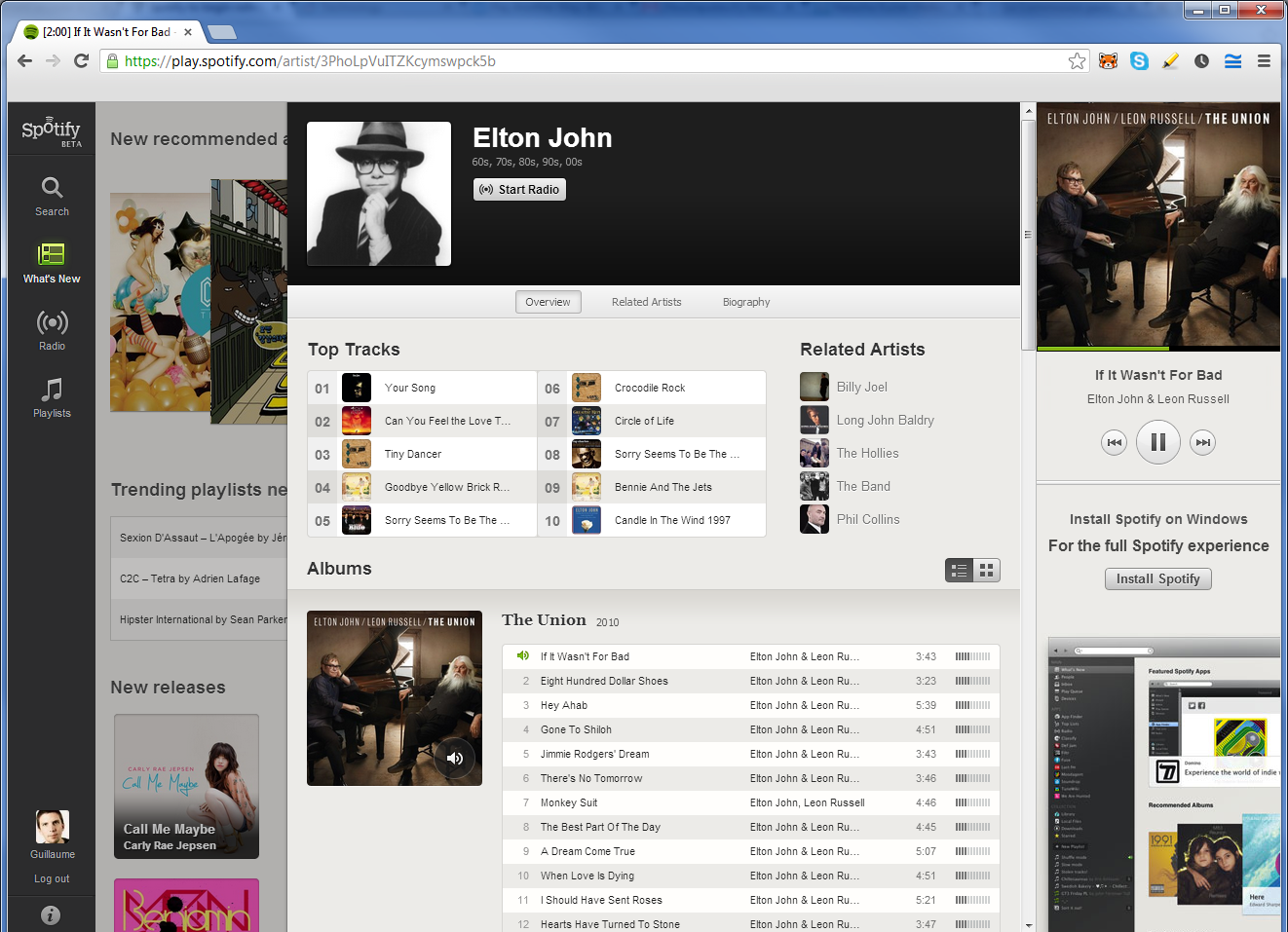 La rumeur courrait depuis longtemps, et c'est désormais officiel. Alors qu'il s'est toujours distingué de Deezer ou Rdio en fonctionnant exclusivement à travers un logiciel à installer sur ordinateur, tablette ou smartphone, Spotify a lancé jeudi soir une version de son service de streaming utilisable simplement à partir du navigateur. Disposant d'une interface différente que celle du logiciel, l'application web permet elle aussi d'écouter la musique de son choix gratuitement, avec publicités audio et visuelles et des limitations de durée, ou d'utiliser le service premium pour une écoute illimité et sans publicité.