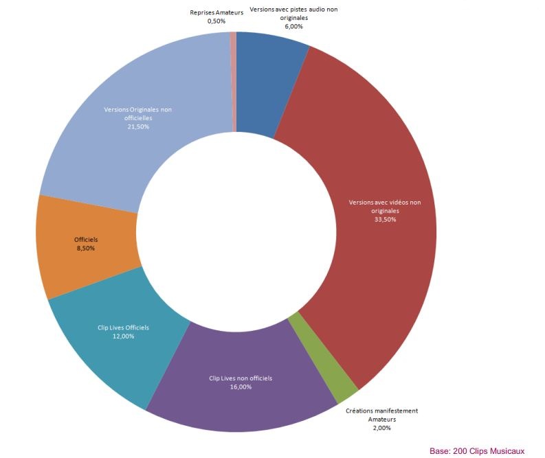 Du fait d'une moindre présence des clips officiels, les clips "non officiels" sont davantage présents sur Dailymotion que sur YouTube. Ils représentent 21,5 % des clips repérés sur la plateforme tandis que les clips live non officiels pèsent 16 % du total. Un tiers (33,5 %) regroupe les versions avec vidéos non originales (ajout de sous-titres, AMV…).