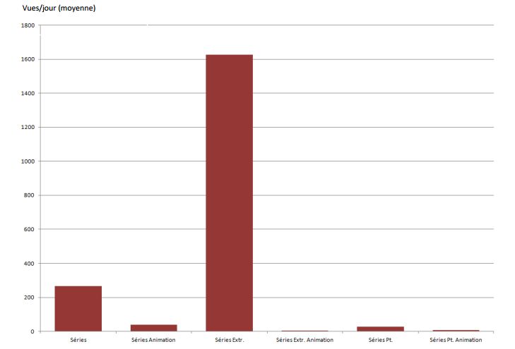 Outre les films, l'étude s'est penchée sur les séries TV. Il ressort que les extraits sont particulièrement prisés par les visiteurs, puisqu'ils concentrent l'essentiel des vues quotidiennes dans le sous-échantillon consacré aux séries TV. Les épisodes complets d'une série arrivent en deuxième position du classement, mais très loin derrière (moyenne de 260 vues / jour contre 1600 vues / jour).