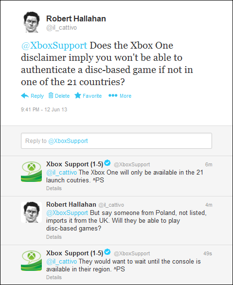 De son côté, un internaute a interpellé le support de la Xbox sur Twitter pour lui soumettre une hypothèse. Si quelqu'un en Pologne, qui est des pays non pris en compte par Microsoft, importe la Xbox One depuis le Royaume-Uni, sera-t-il en mesure de jouer à des jeux vendus sur disque (DVD, Blu-Ray) ? La réponse du support est évasive, invitant ceux situés dans d'autres pays à attendre la disponibilité de la console.