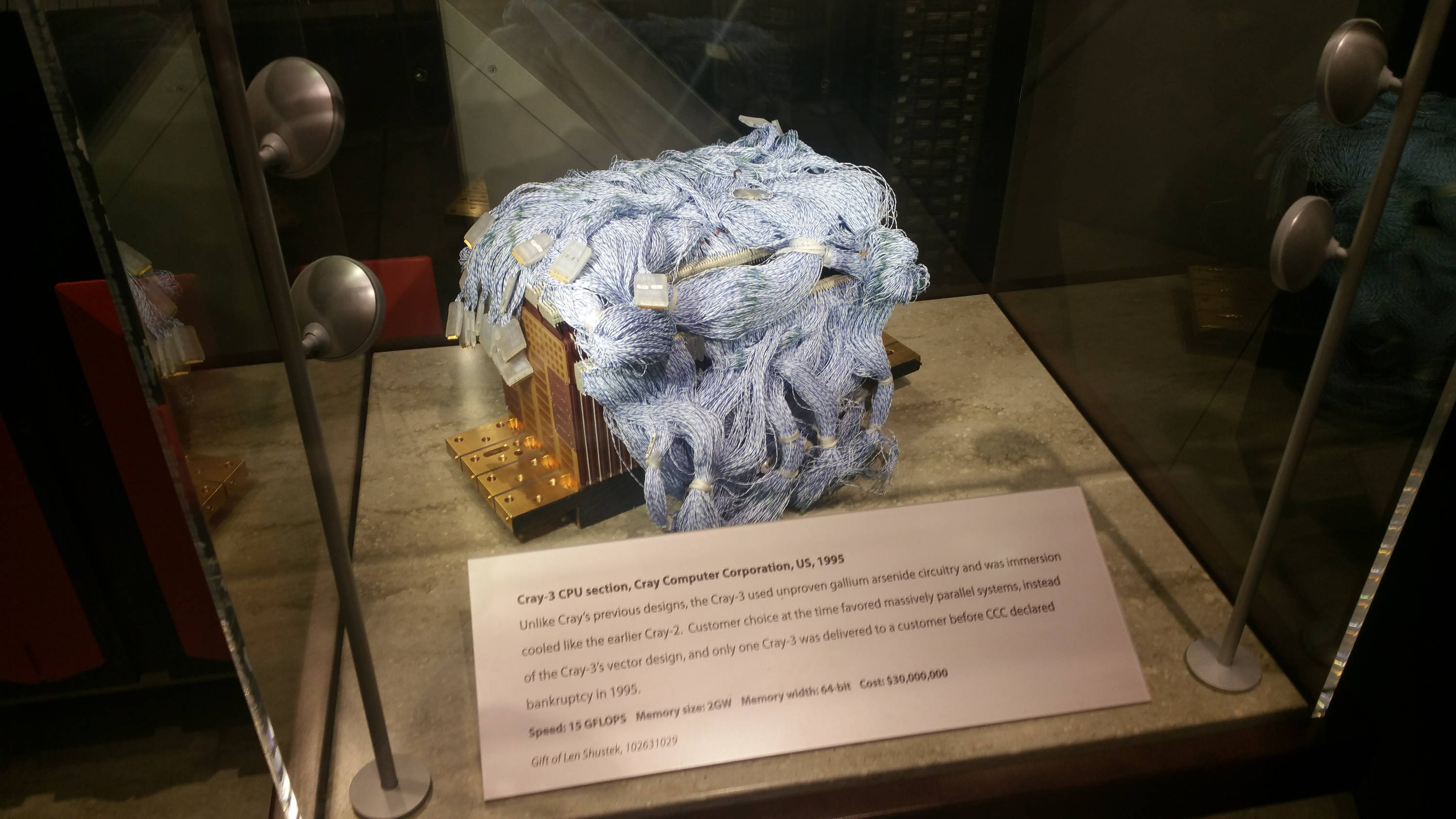 Nous posons les pieds dans la zone de North Bayshore. Les arbres remplacent le goudron. À notre droite apparaît vite un grand bâtiment : le Computer History Museum, le plus grand musée d’informatique au monde. Une fois payé le ticket à prix californien (18 dollars), c’est parti pour trois à quatre heures dans une collection remarquable de calculateurs, tubes à vide, câbles et autres merveilles.