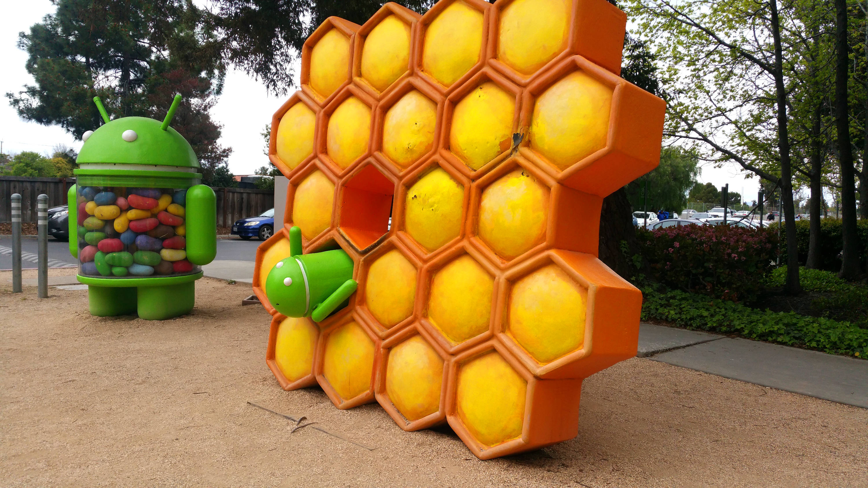 Un bout de marche plus loin, derrière deux bâtiments, se trouve la cour aux Android : un carré de sable où se dressent des statues kitsch représentant chaque version du système d’exploitation. Un panneau dit que « les photos sont encouragées ».