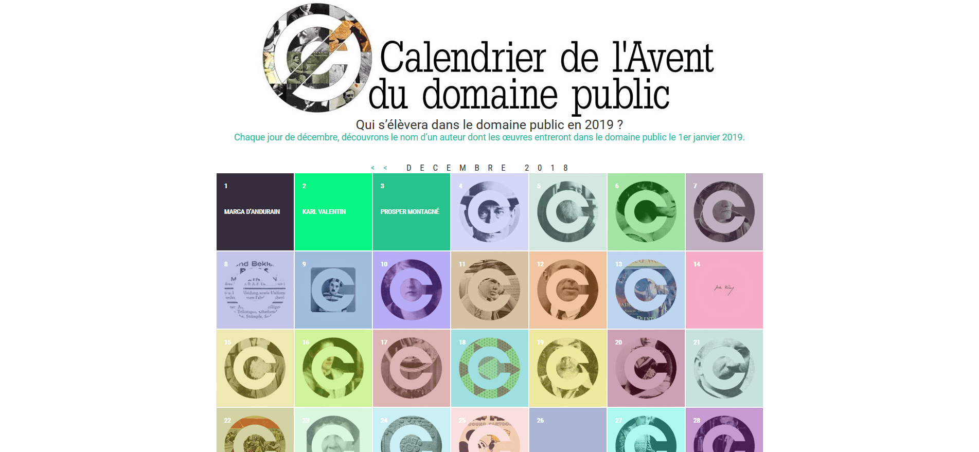 Ce calendrier de l’Avent un peu particulier, c’est celui du domaine public. Peut-être connaissez-vous déjà le principe : chaque jour de décembre et jusqu’au 30, le collectif SavoirsCom1, à l’origine de l’initiative, présente une personnalité artistique ou culturelle décédée il y a plusieurs dizaines d’années et dont les droits patrimoniaux expireront au tout début de l’année suivante. Ici, 2019.