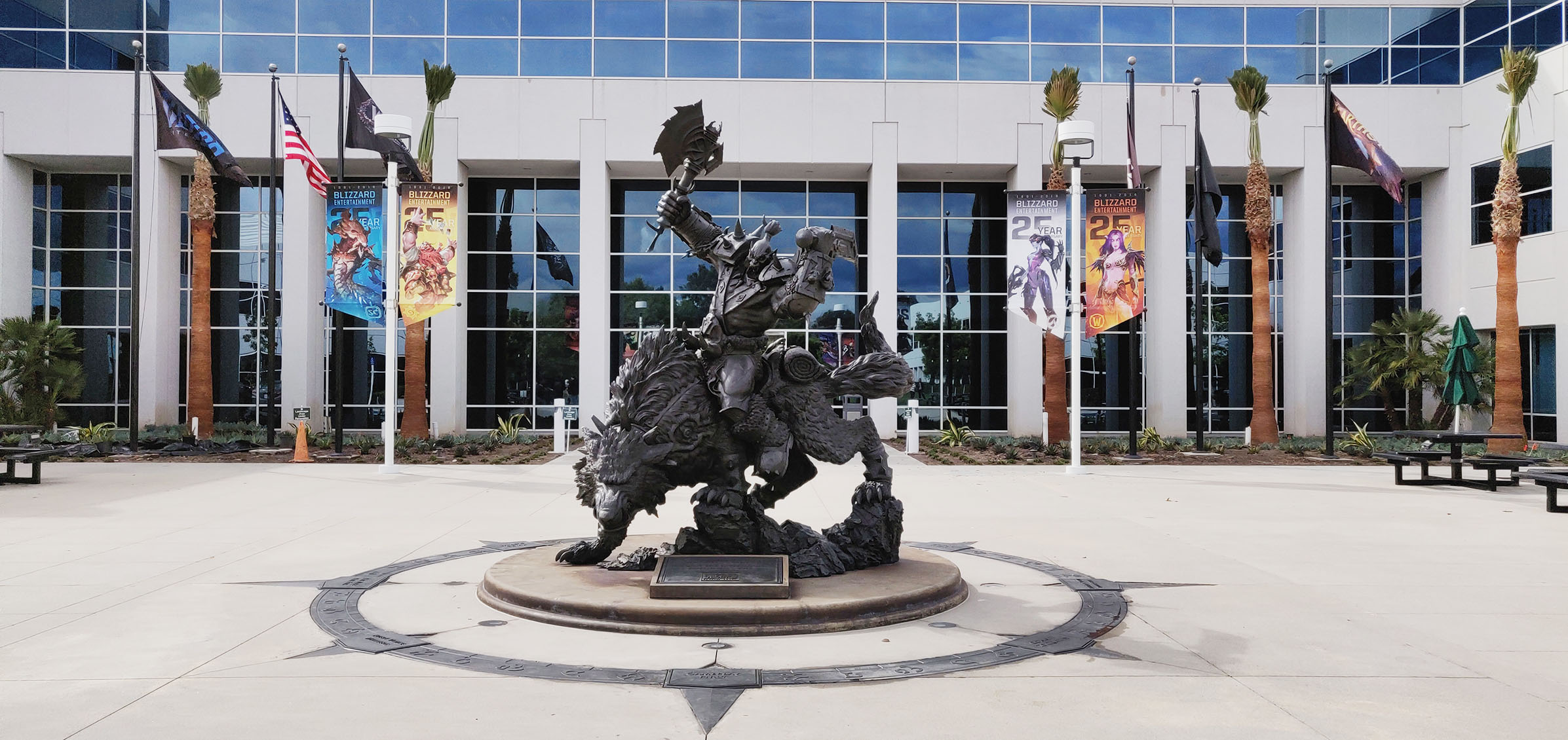 L'iconique statue du campus de Blizzard, autour de laquelle sont gravées au sol les différentes valeurs de l'entreprise.