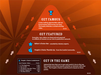 De fait, Crackle veut devenir un Youtube sélectif, qui ne proposerait au public que les meilleurs contenus, en attirant les meilleurs créatifs par la visibilité que peut offrir Sony grâce à ses multiples services et produits disponibles sur le marché. « Nous pouvons offrir le chemin vers Hollywood et vers la gloire« , résume modestement Felser. Les réalisateurs qui postent des vidéos de qualité sur Crackle pourront intégré les studios Sony Pictures, ou voir leurs œuvres distribuées sur le Playstation Network, ou avec des produits comme les téléviseurs Bravia. Des concours sont organisés, qui n’offrent pas seulement de l’argent ou des cadeaux matériels, comme sur beaucoup d’autres sites, mais des cadeaux beaucoup plus personnels. Les gagnants de concours d’animation pourront ainsi visiter et peut-être intégrer les studios Sony Picture Imageworks et Sony Pictures Animation, par exemple.