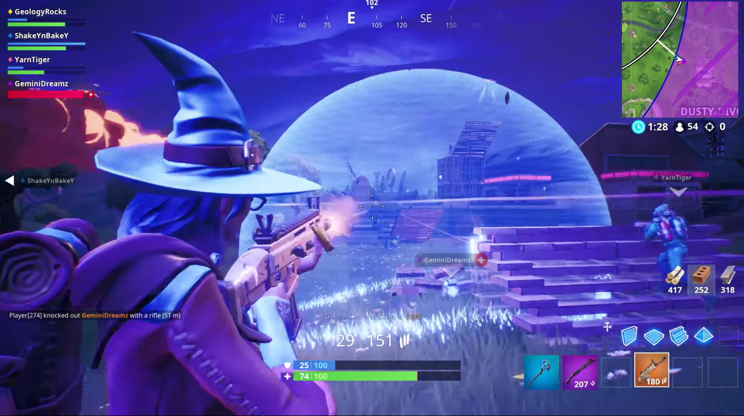Fortnite est un jeu de survie et de construction dans lequel 100 joueurs maximum sont lancés sur une île et doivent s’éliminer. Pour que la partie ne dure pas infiniment, il existe une « tempête » qui se déclare à chaque début de partie et qui restreint petit à petit la zone de la carte dans laquelle les joueurs peuvent évoluer. S’ils restent dans la tempête, ils subissent des dégâts progressifs, et meurent rapidement.