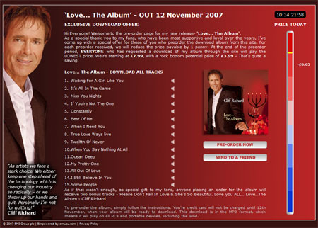 Les fans peuvent ainsi se rendre sur le site LoveCliffRichard.com et écouter des extraits de chacune des 15 chansons de l’album. Ils peuvent ensuite pré-commander l’album en téléchargement s’ils le souhaitent, à un prix de départ fixé à 7,99 ⣠(env. 10,3 euros). Mais pour chaque pré-vente enregistrée, le prix baisse de 1 centime. Le jour de la sortie de l’album, chacun des internautes qui a pré-commandé l’album est débité du prix le plus bas atteint grâce aux ventes. Le seuil en dessous duquel le prix de l’album ne baissera plus a été fixé à 3,99 ⣠(4,4 euros). Ceux qui ont joué le jeu recevront en plus deux chansons bonus supplémentaires, qui ne figureront pas sur l’album dans les bacs.