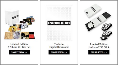 Avec le buzz qui règne autour d’In Rainbows, EMI ne pouvait pas rester les bras croisés. Du coup, la major a décidé de faire fructifier le back catalogue du poulain qui vient de quitter son étable en proposant une offre qui lui ressemble de loin, mais qui est loin de lui ressembler. Pour le principe, EMI présente, un peu à la manière de Radiohead, plusieurs packaging qui laissent le choix au consommateur entre l’acquisition d’une version numérique (MP3s sans DRM à 320 kpbs), d’une version physique (boîtiers CDs) ou même d’une version clé USB des 7 albums produits entre 1993 et 2003.