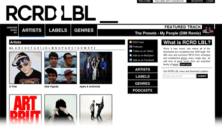Sylvie Krstulovic nous fait part sur son blog (merci Sylvie :)) d’une initaitive qui nous avait échappée. Peter Rojas, qui n’est autre que le créateur de trois des blogs les plus visités au monde (Engadget, Gizmodo et Joystiq) s’est lancé dans la musique en ligne avec le site RCRD LBL. Derrière ce nom barbare et selon nous très mal choisi – il s’agit de « record label » sans les voyelles, se trouve un site originale à la croisée entre le magazine, le blog et le site de téléchargement classique. Le tout en respectant au maximum à la fois les artistes, les labels et le public.