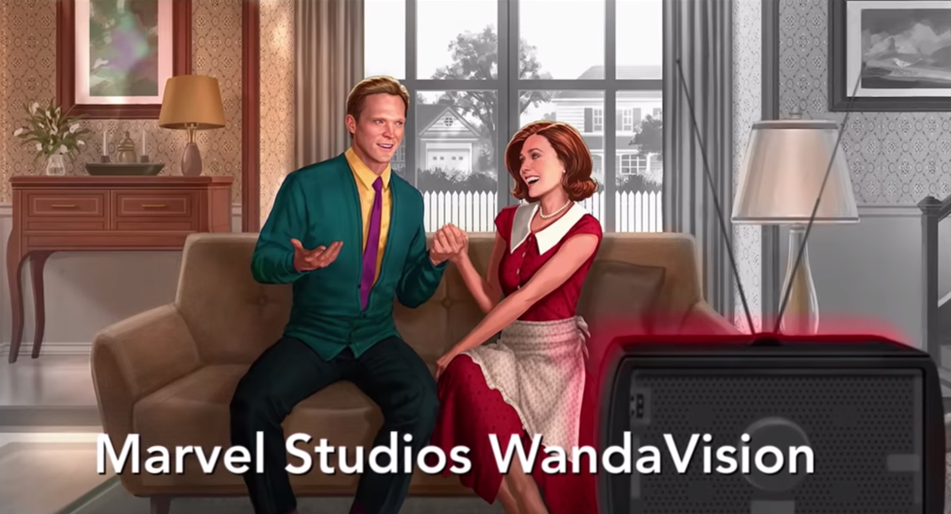 La photo promo ressemble volontairement à une parodie de sitcom des années 50, d’un couple qui semble ordinaire — mais ne l’est pas vraiment, notamment parce que Vision est un robot doté d’une conscience qui s’est libéré du contrôle de son maître, et est capable d’avoir des sentiments amoureux.