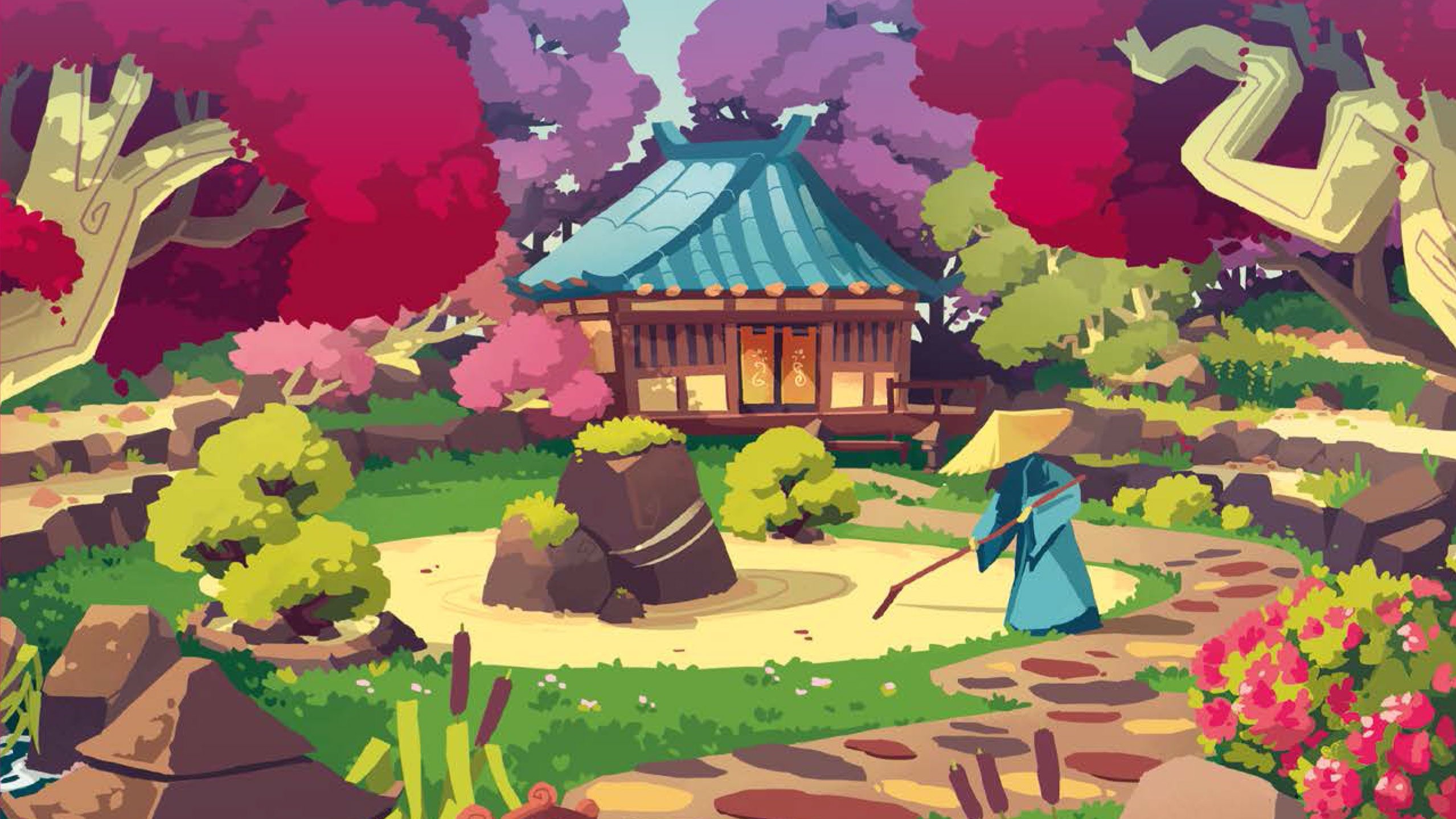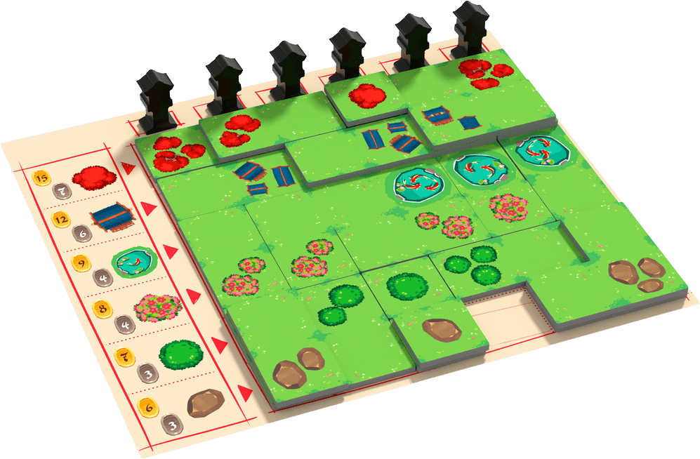 Chaque joueur a son jardin personnel devant lui, un plateau quadrillé, complètement vide pour le moment. À chaque ligne correspond un aménagement (arbre, pagode, étang, etc.).