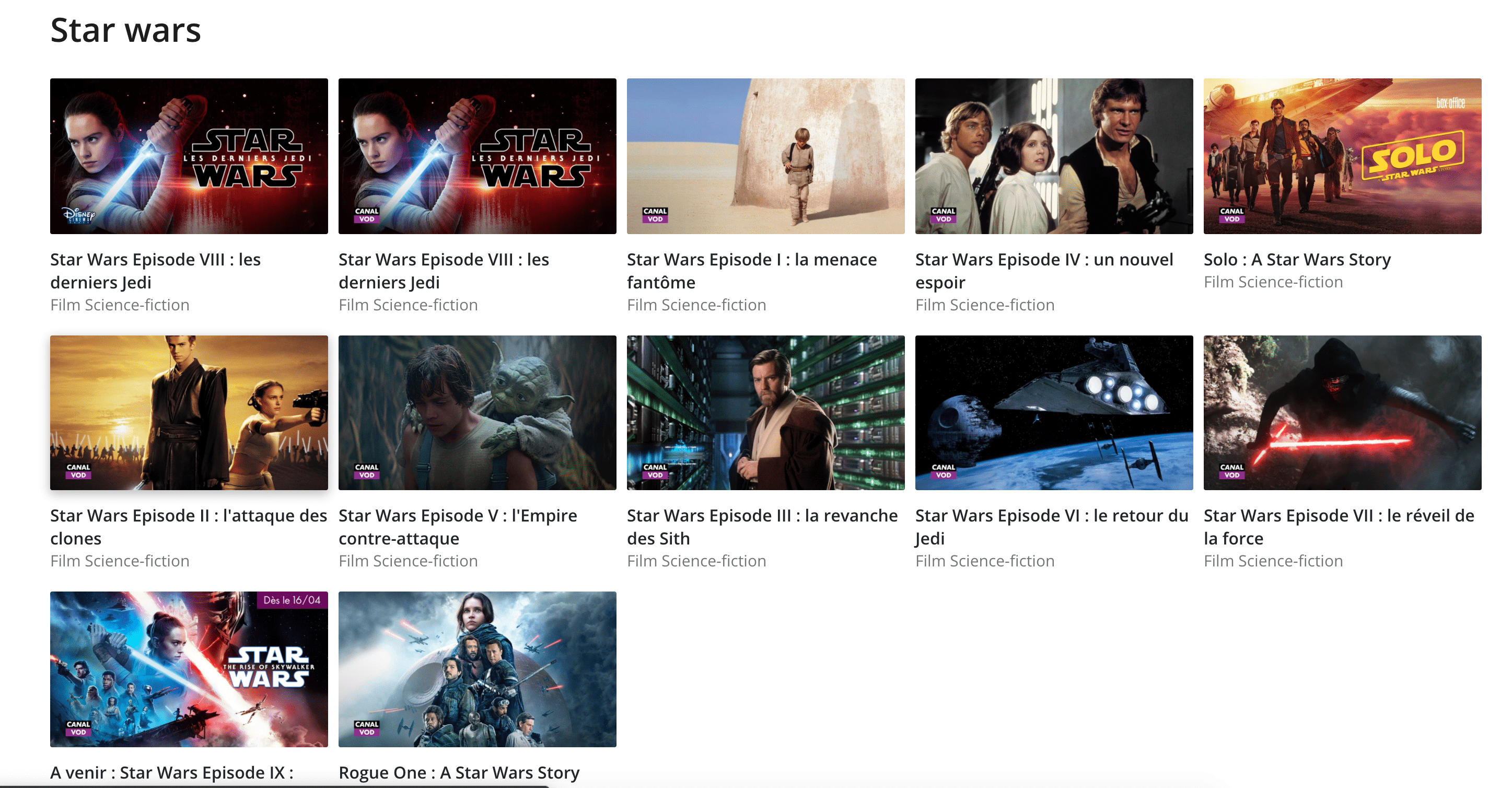 Même sans cela, Canal+ peut compter sur des achats à l’acte pour compléter son offre, via un catalogue en VOD que Disney+ ne propose pas. Ainsi, le catalogue Star Wars est-il artificiellement gonflé avec des titres qui ne sont pas proposés en streaming dans l’abonnement. L’illusion fait effet.