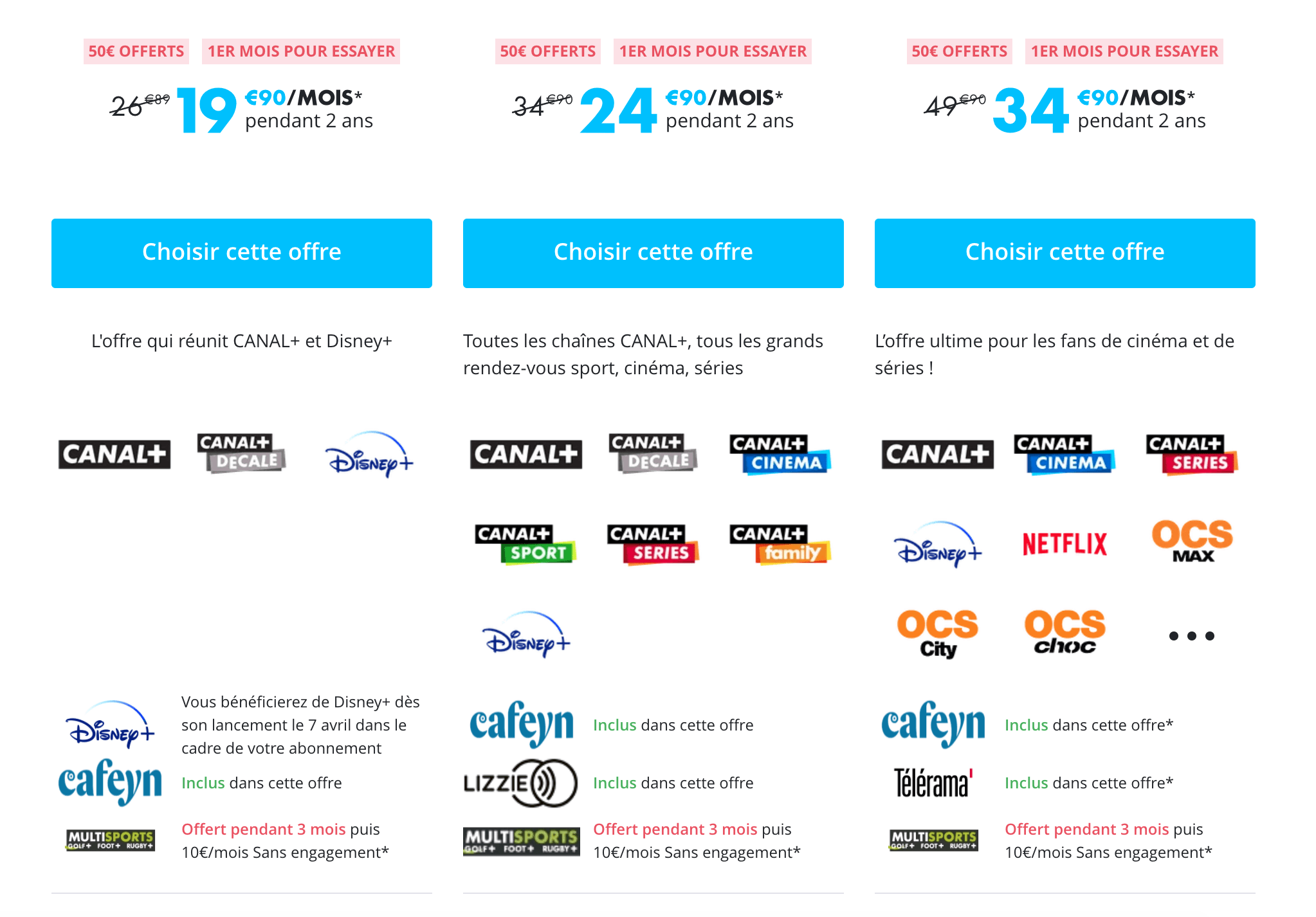 Soit l’on s’accommodera de cette situation et en ce cas, l’abonnement classique à Disney+ suffira : c’est aujourd’hui le moins cher de toutes les offres et celui qui est proposé sans engagement au prix le plus bas, avec un catalogue déjà conséquent (si vous aimez les programmes familiaux). Vous pourrez tout à fait l’abandonner un mois et le reprendre ensuite, au gré des envies. En revanche, l’abonnement à Canal+ le moins cher, proposé à 19,90 €, n’a aucune des chaînes Canal… et c’est sur ces chaînes que l’on trouve le catalogue complet cité ci-dessus : ce n’est pas une option que nous pourrions recommander à une personne qui ne s’intéresse pas vraiment à l’univers Canal+.