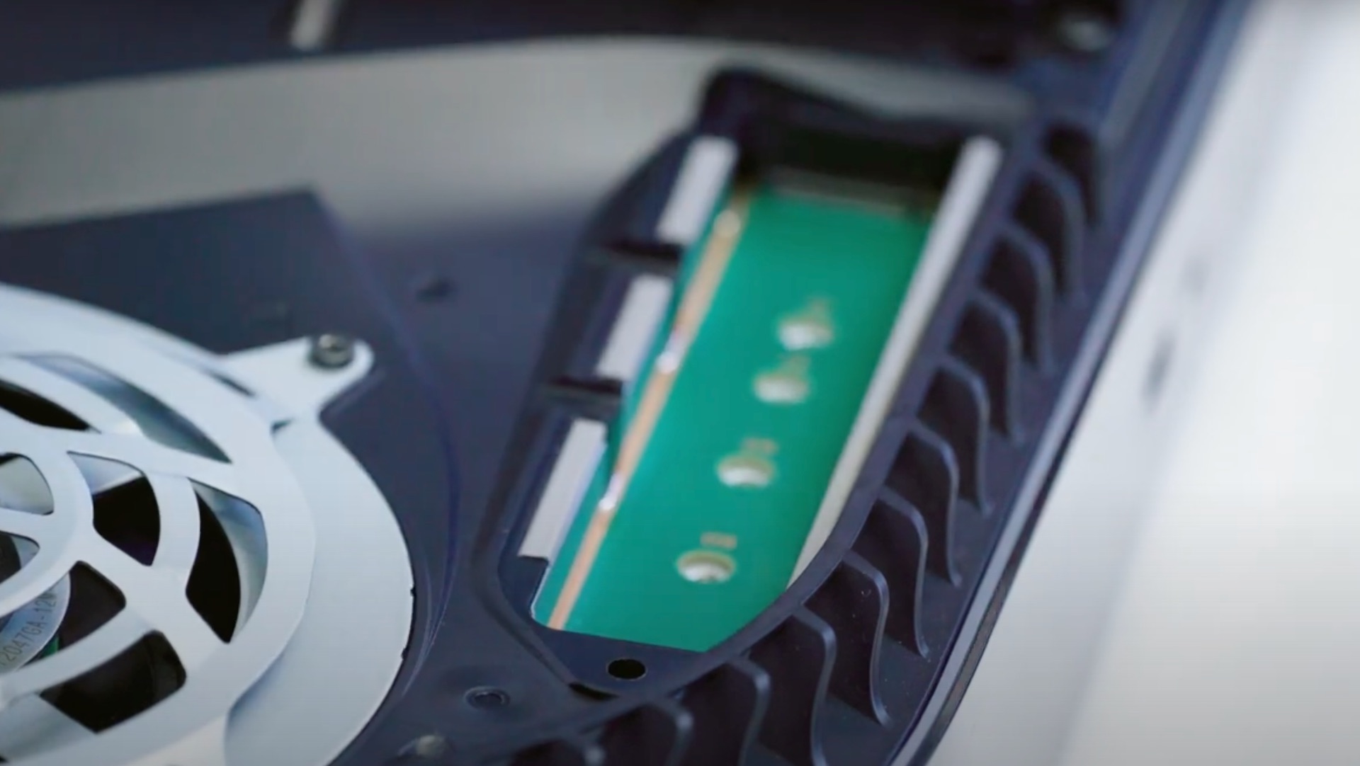 Pour le stockage additionnel, la PS5 s’appuie sur l’interface PCI Express M2 compatible jusqu’à la norme 4.0. Pour l’installer, il suffit de retirer la coque supérieure et d’insérer le SSD compatible dans l’espace prévu à cet effet. La procédure à suivre rappellera l’installation d’une barrette de RAM à celles et ceux qui sont habitués à monter des PC.