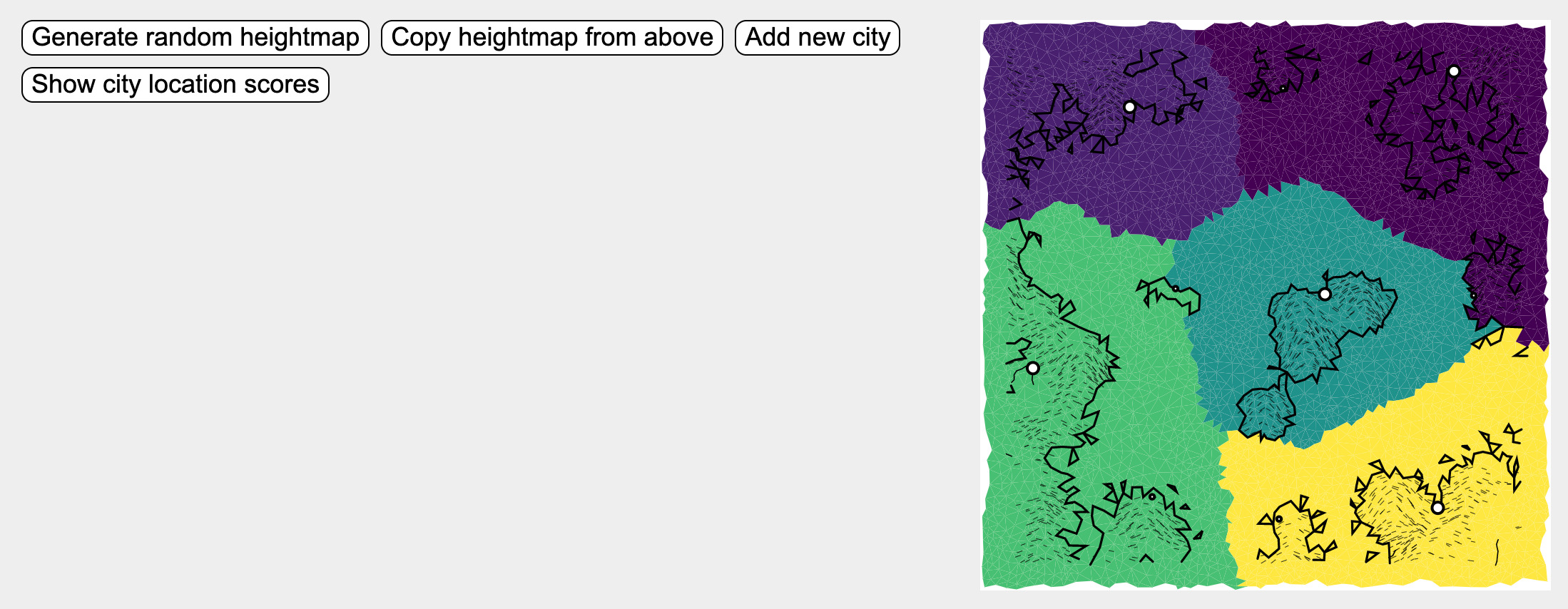 Vous avez désormais la base de votre carte. Comme pour les autres étapes, il faudra commencer par cliquer sur « copy heightmap from above ». Ensuite, le générateur placera pour vous les villes si vous cliquez sur « add city » (vous ne pouvez pas non plus choisir la taille de la ville : plus vous en ajoutez, plus elles seront petites). À noter cependant que les emplacements ne sont jamais choisis au hasard : les villes sont toujours soit sur la côte, soit au bord d’une rivière, ce qui est très réaliste. Au fur et à mesure que vous ajoutez des villes, des frontières apparaitront également sur la carte. Là aussi, vous ne pourrez pas choisir leur emplacement, mais si vous cliquez sur « show territories », les différentes couleurs vous permettront de mieux voir les différents pays (les couleurs n’apparaitront pas sur le résultat final). Chez nous, ça donne ça :