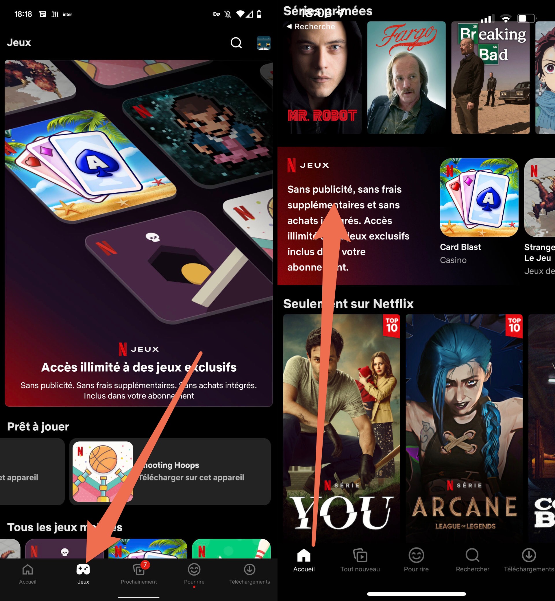 Techniquement, pour profiter des jeux offerts, il suffit de se rendre dans la section « Jeux » de l’application Netflix sur mobile. Il est possible cependant que votre application ne soit pas encore dotée de ce nouvel onglet, le déploiement est plutôt lent. Si le menu est disponible, vous le verrez en bas de votre application sur Android ou sur un bandeau dédié sur iPhone.