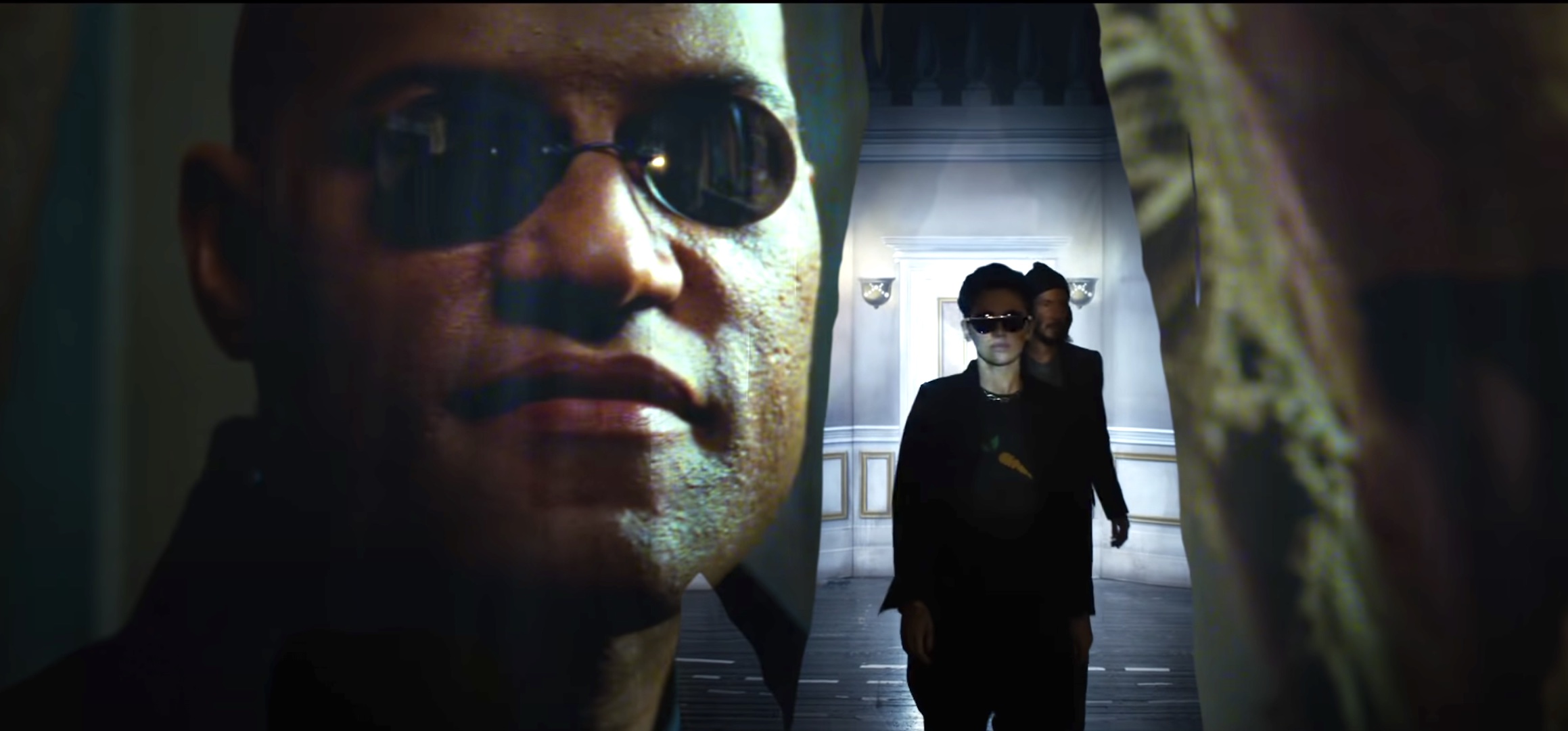 Lorsque Keanu Reeves pénètre dans la pièce sombre, l’espace d’un instant, on pourrait croire que c’est Laurence Fishburne qui l’accueille. Il s’agit en fait d’un rétroprojecteur qui diffuse sur un mur l’image de Morpheus, lors de sa première rencontre avec Neo dans Matrix (1999).