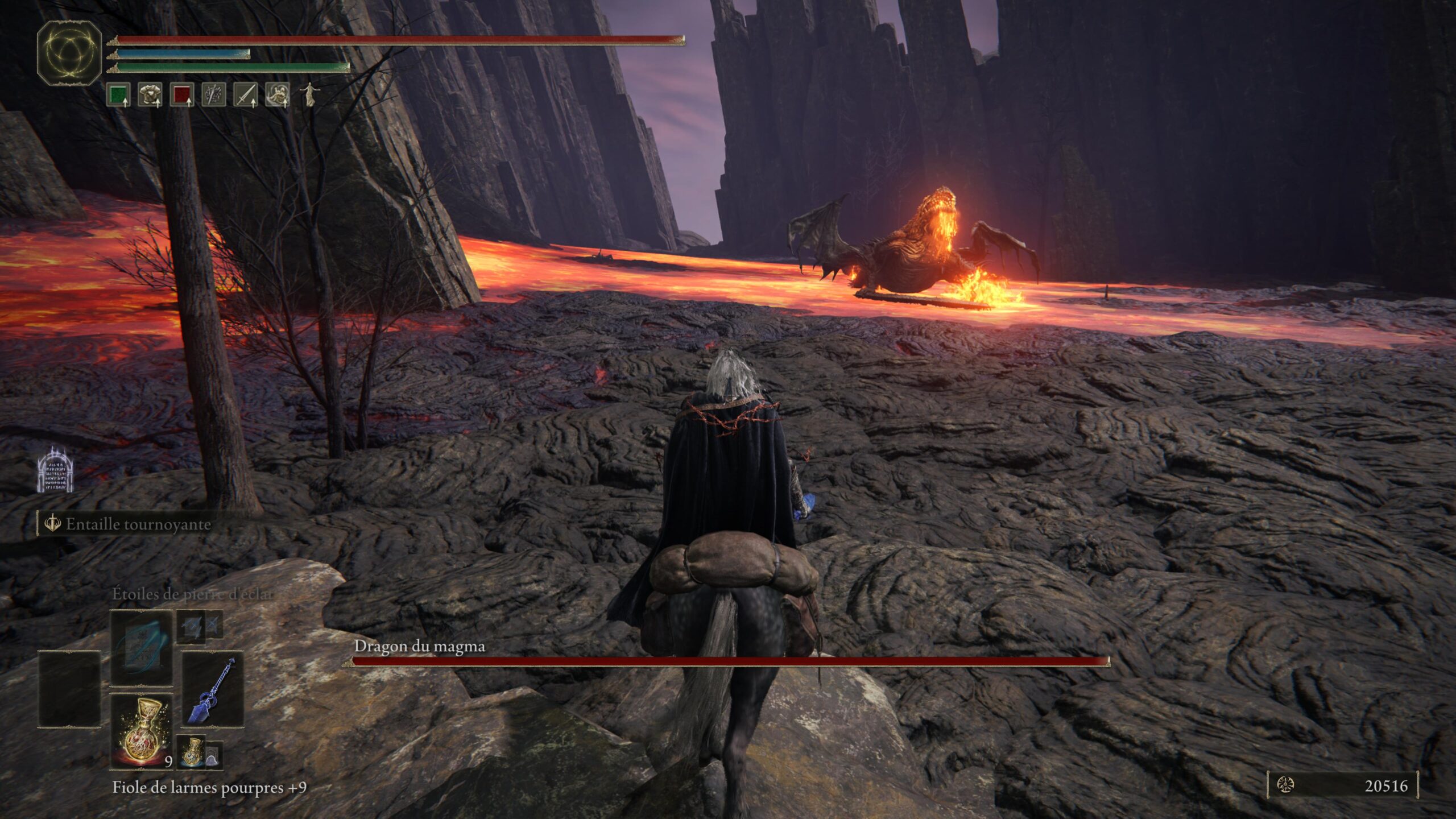 Une fois le château en face de vous, continuez vers la gauche jusqu’à tomber sur un boss secondaire : le Dragon du magma, que vous pouvez choisir d’affronter ou non. Il repose sur de la lave qu’il faut traverser sans aucune crainte (votre cheval prendra quelques dégâts, mais la traversée n’est pas assez longue pour le tuer).