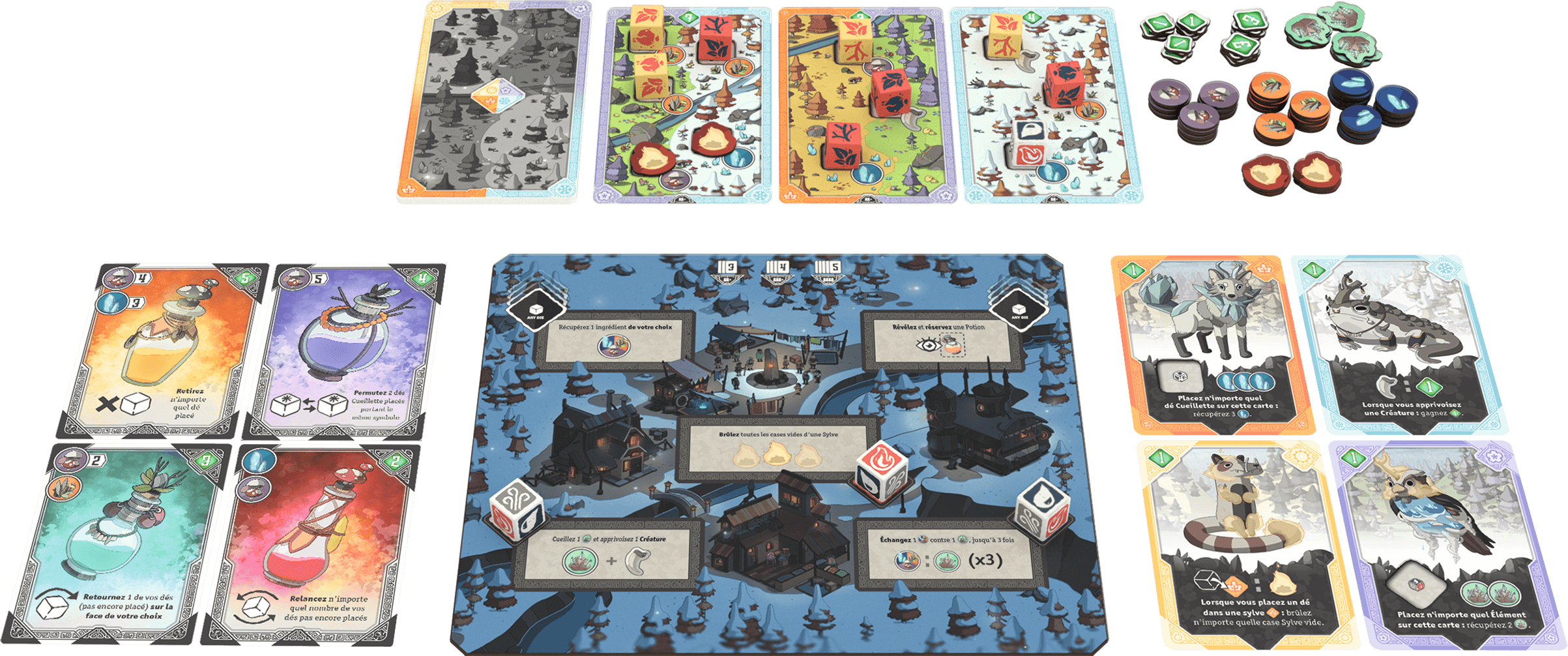 Pendant son tour, on doit obligatoirement placer un de ses dés sur un emplacement libre, soit dans le village, soit dans une forêt. Cela nous permet, essentiellement, de récupérer un ingrédient ou d’apprivoiser une créature.