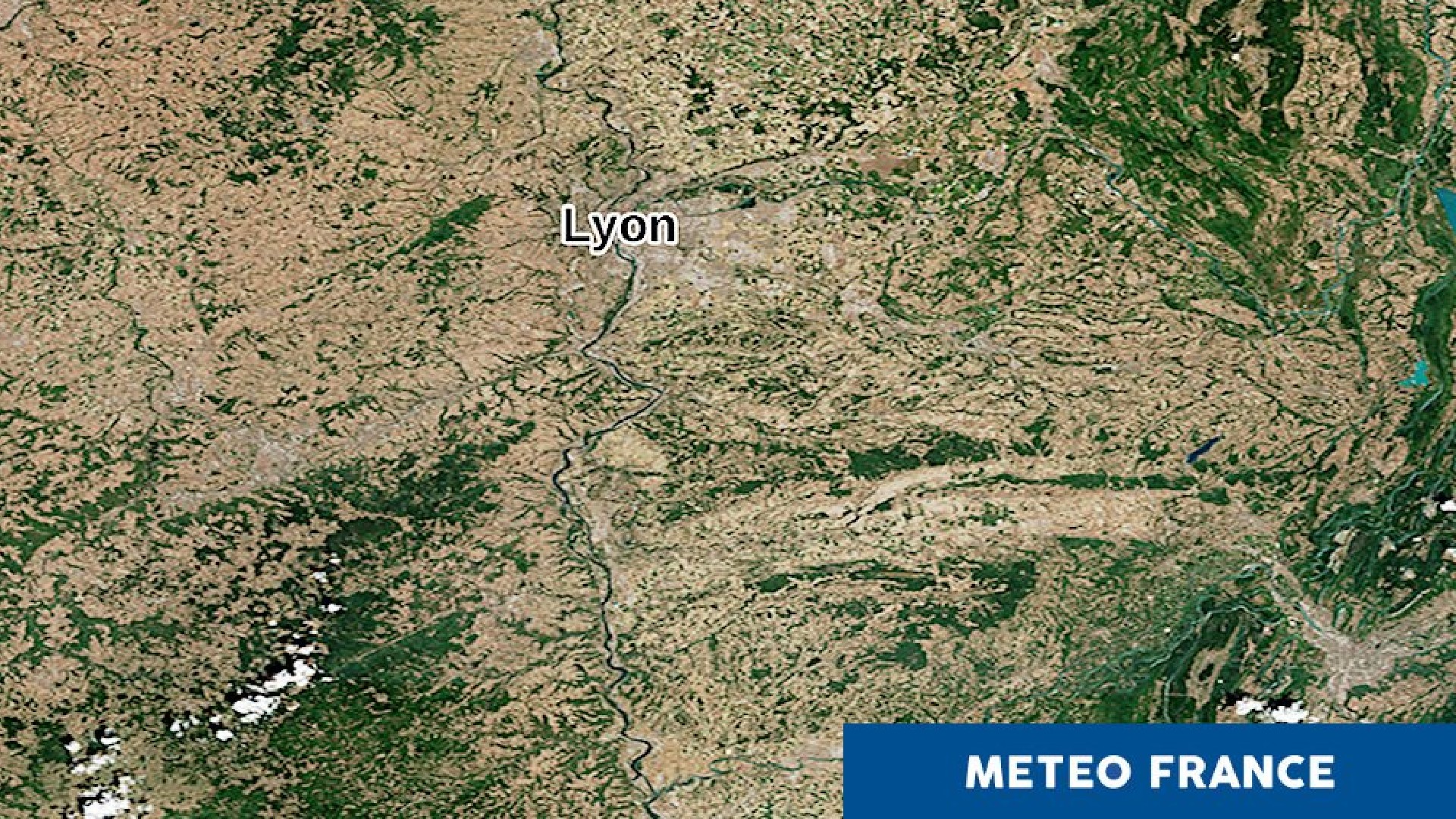 L’image de Météo-France comprend toute la région lyonnaise. Sur le carton de gauche, on voit la zone au 10 août 2021 — l’année dernière –, un été décrit comme humide. Sur le carton de droite, en revanche, il s’agit de l’exacte même zone, mais le 10 août 2022, il y a quelques jours, alors que les incendies font rage dans la région.