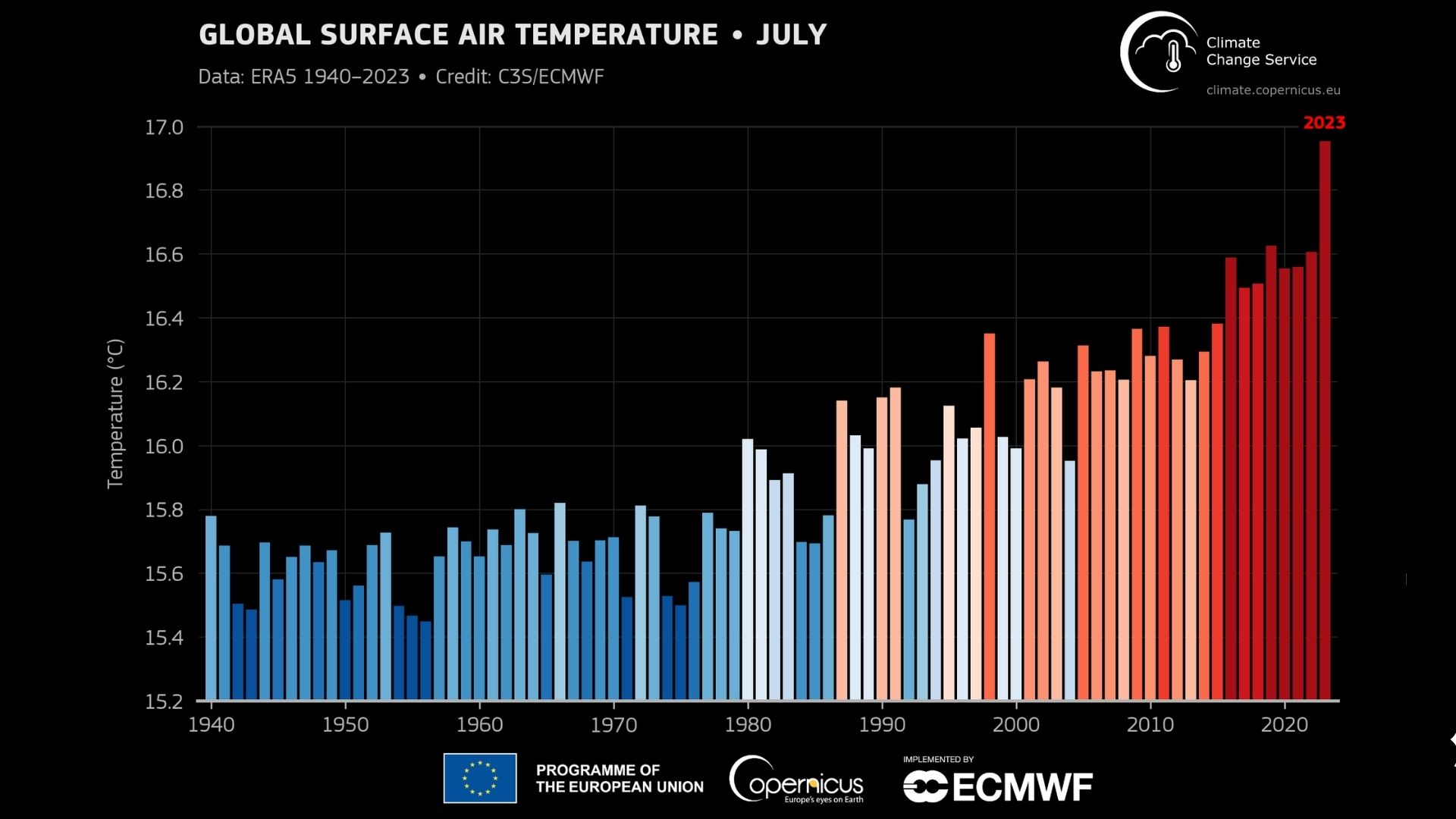 Le graphique livré par Copernicus est parlant : sur cette représentation, ci-dessous, des mois de juillet depuis 1940, le pic rouge, parfaitement visible, correspond au mois de juillet 2023.
