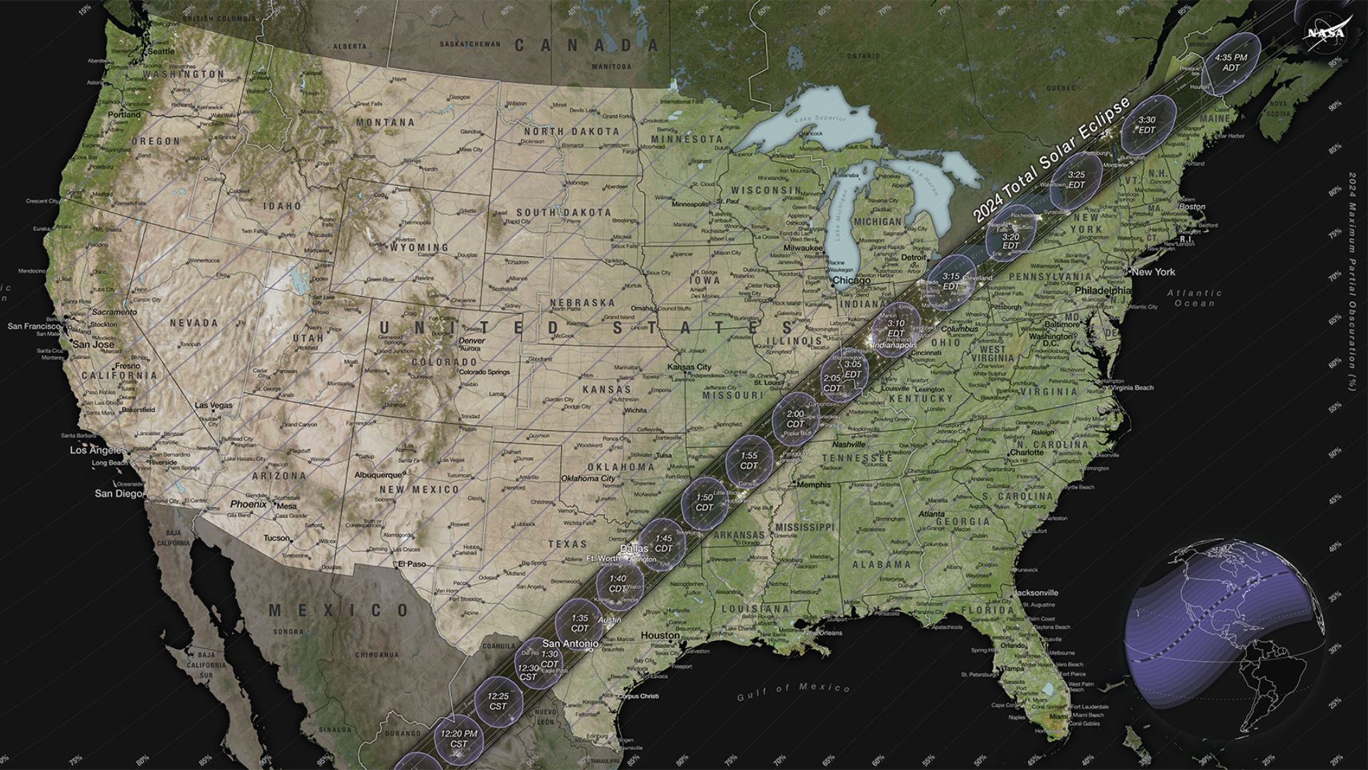 Si l’on compare cette carte à celle de la Nasa, qui montre la bande de totalité de l’éclipse aux États-Unis, la ressemblance est d’autant plus frappante. On voit qu’elle traverse le Texas, l’Oklahoma, l’Arkansas, le Missouri, l’Illinois, le Kentucky, l’Indiana, l’Ohio, la Pennsylvanie, l’État de New York, le Vermont, le New Hampshire et le Maine.