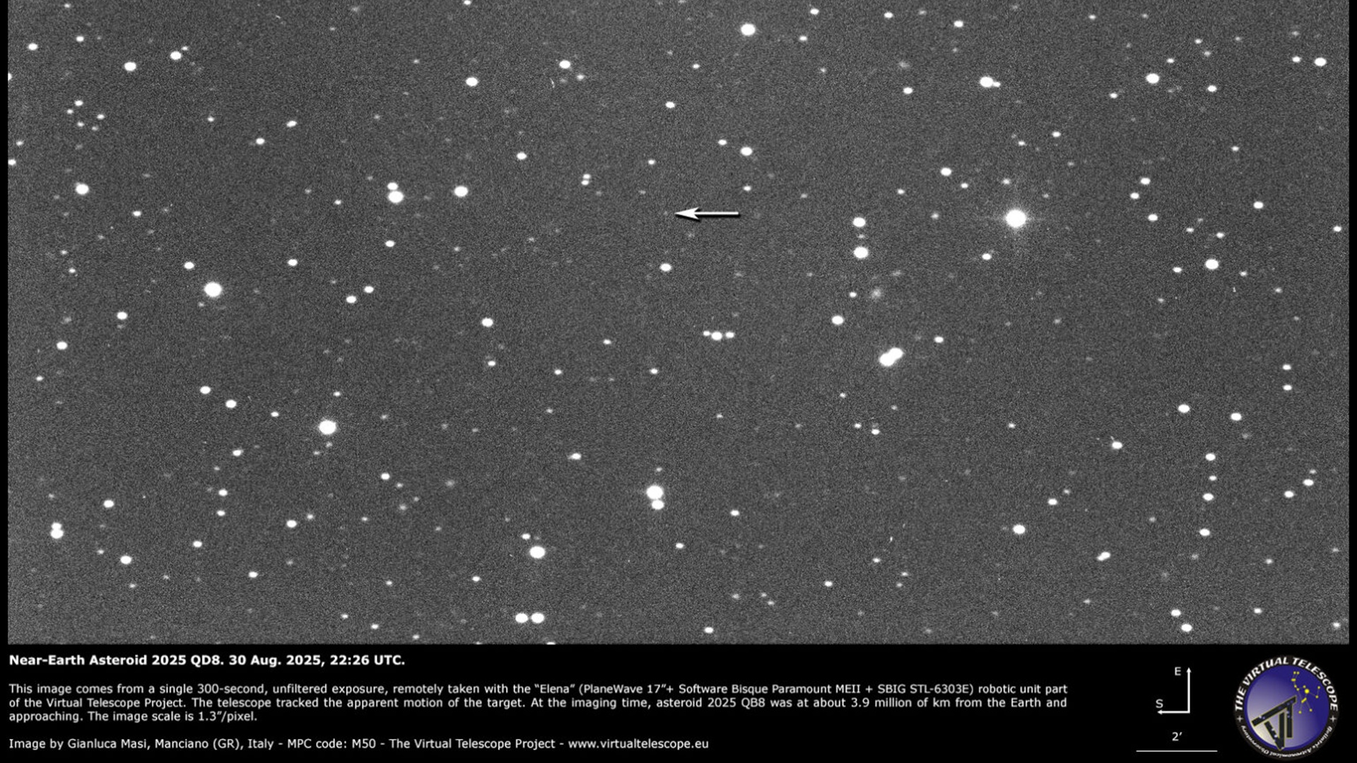 Pour revenir au cas de 2025 QD8, il voyage à une vitesse d’environ 45 000 hm/h et a une taille estimée quelque part entre 17 et 38 mètres. Il a été repéré récemment, et a déjà été observé avec le Virtual Telescope Project qui avait pris une image le 30 août. Il se trouvait alors à 3,9 millions de kilomètres.